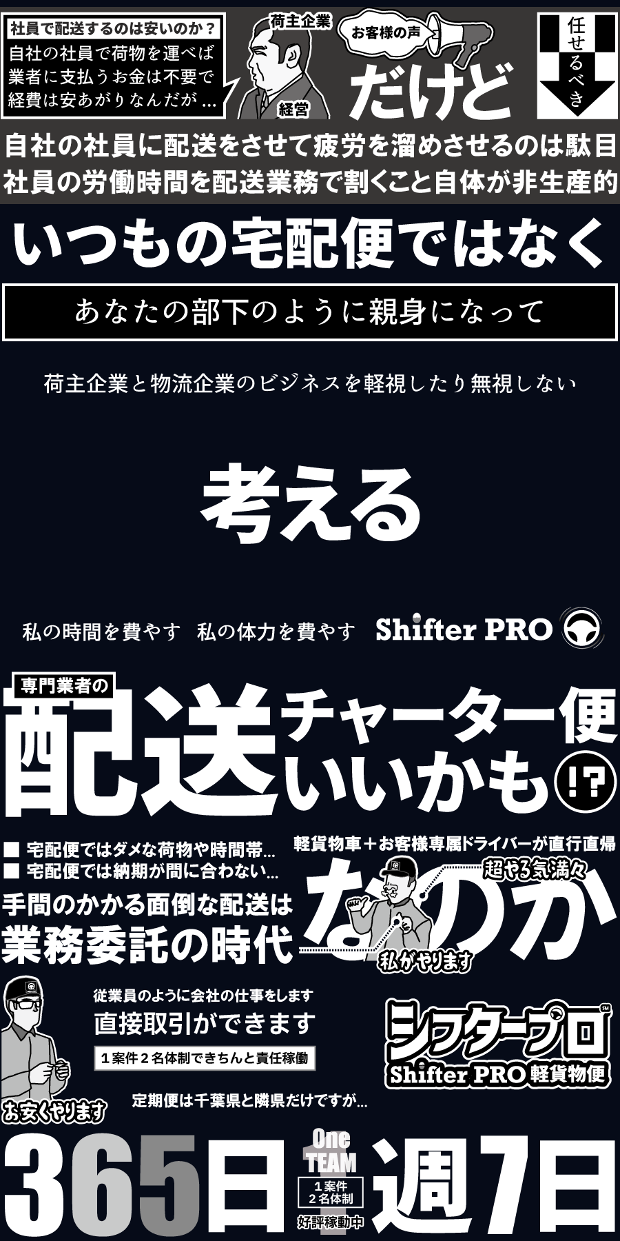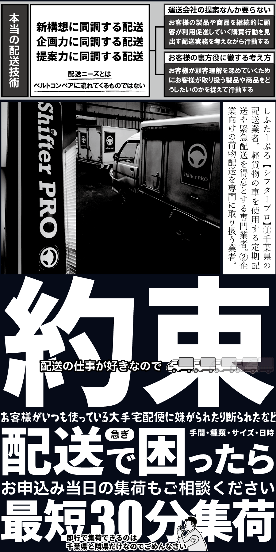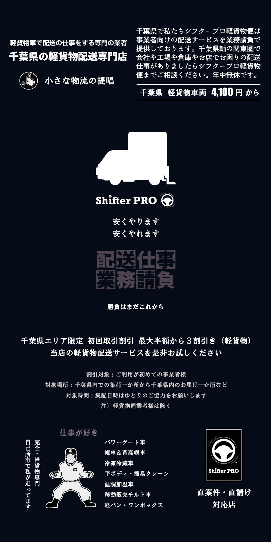 シフタープロ軽貨物便は千葉県の全域での、定期配送、当日便、緊急便、至急便、軽貨物チャーターを365日24時間で年中無休の稼働をワンチーム責任稼働体制でお客様からダイレクトに業務請負しています。関東圏、都内や千葉隣県もシフタープロ軽貨物の便が