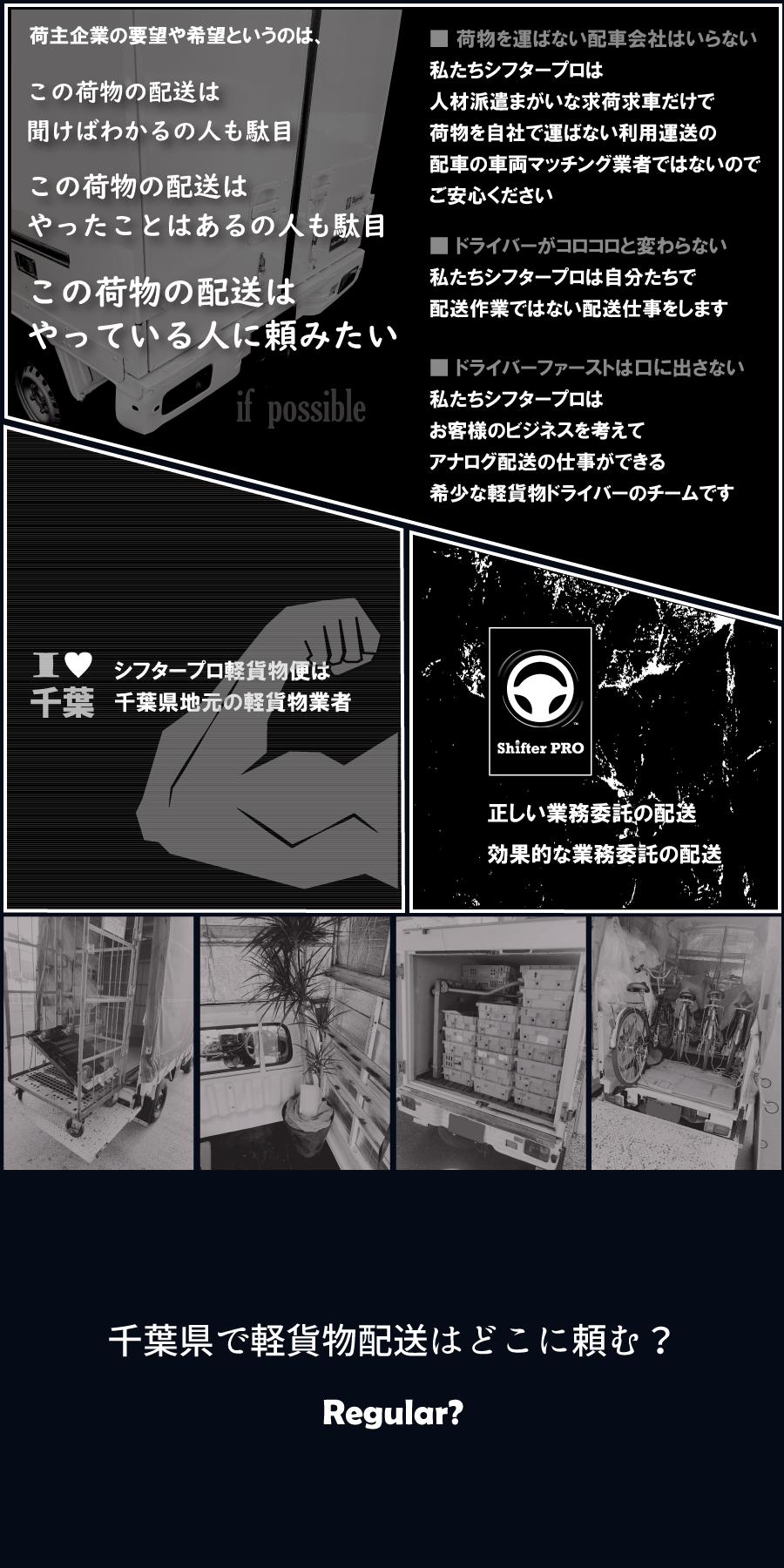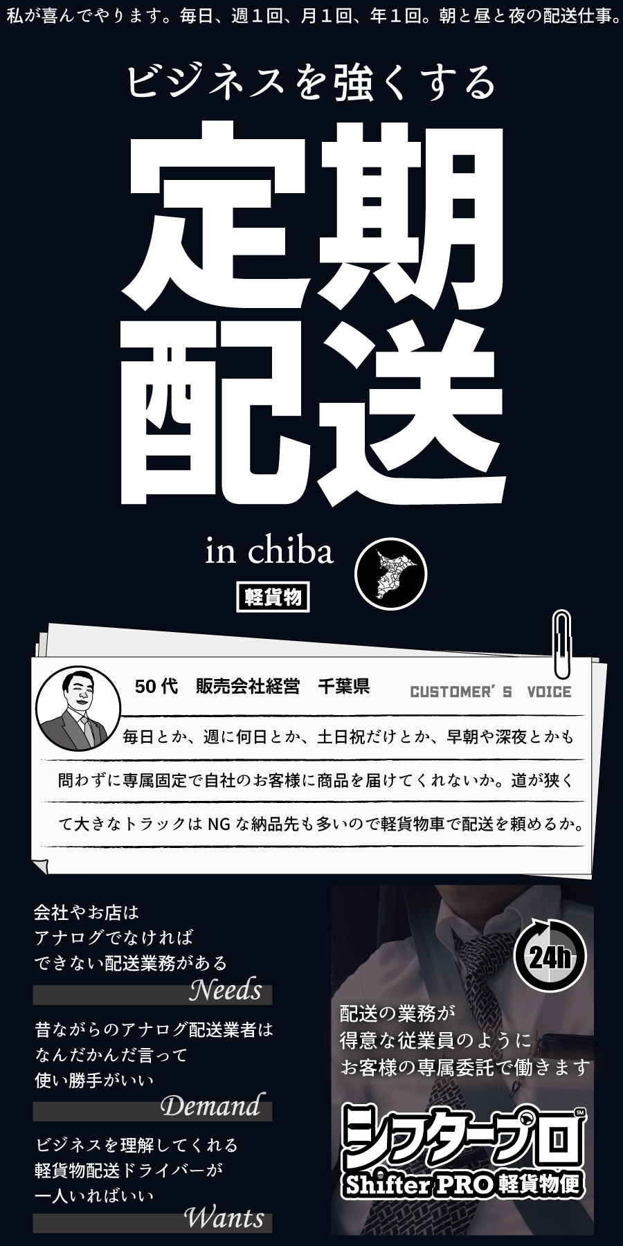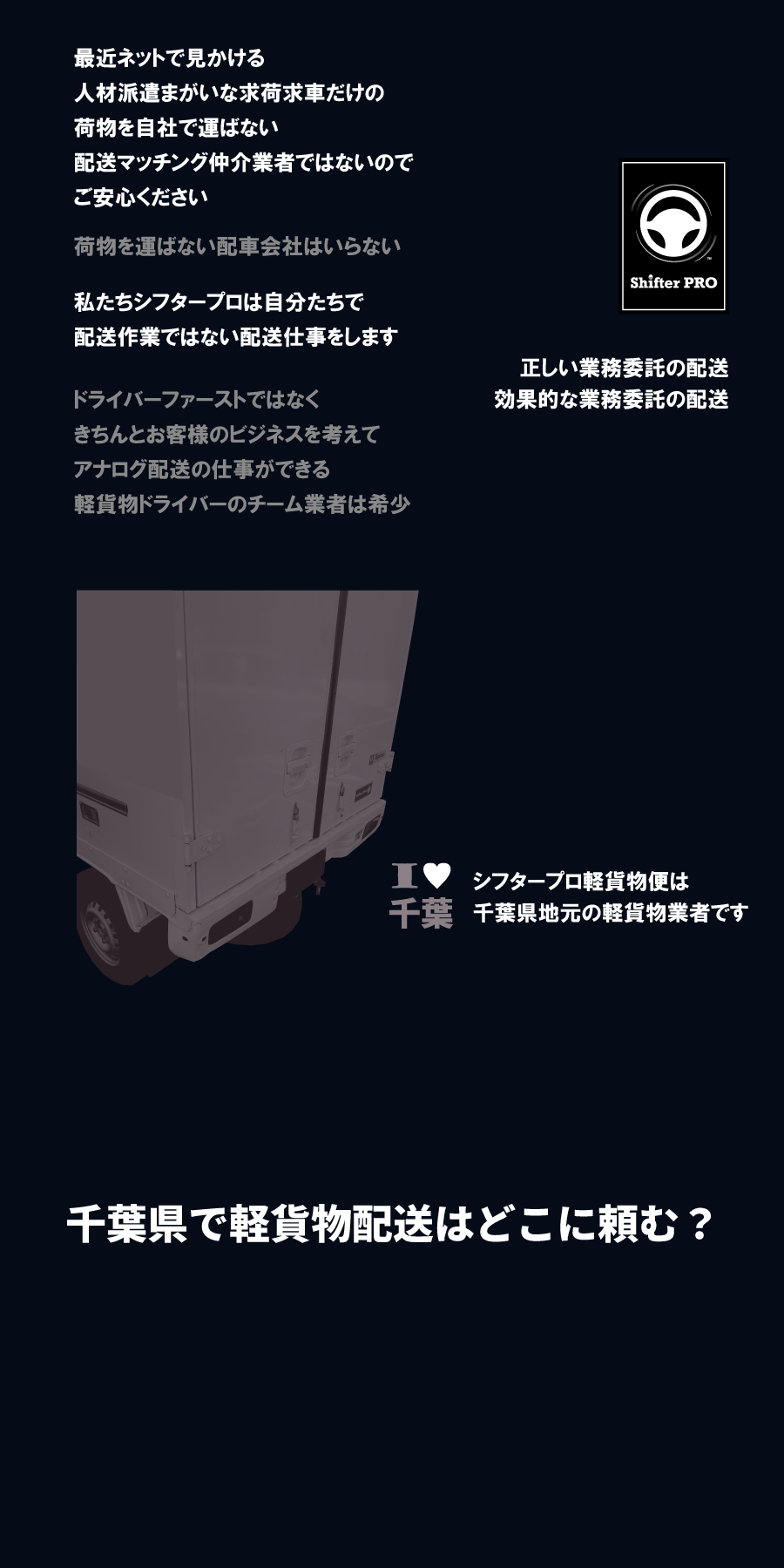 シフタープロ軽貨物便は千葉県の全域での、定期配送、当日便、緊急便、至急便、軽貨物チャーターを365日24時間で年中無休の稼働をワンチーム責任稼働体制でお客様からダイレクトに業務請負しています。関東圏、都内や千葉隣県もシフタープロ軽貨物の便が