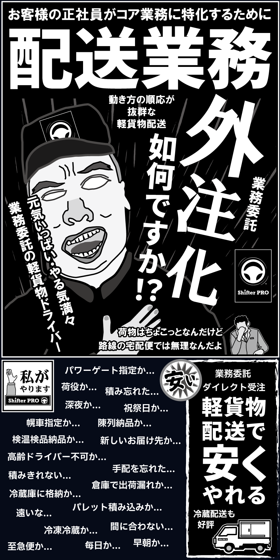 新規お取引の増加に伴って新たにシフタープロ軽貨物便のレギュラーで働いていただける専属ドライバーさんを千葉エリアと東京エリアと埼玉エリアで求人募集を開始いたしました。私たちシフタープロ軽貨物便の仕事業務は同業者様とは異なり、大手宅配便のような