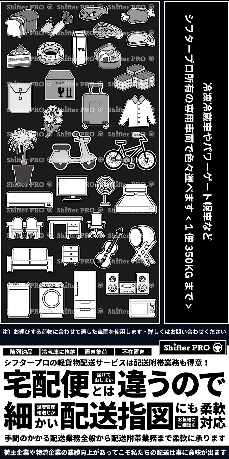 シフタープロは軽貨物車による配送が事業領域です。軽貨物車は1回1便で運べる重さは350kgまでの荷物となっています。車両の荷台幅や高さや奥行きは幌車や箱車や平ボディや軽バンといった車種により積載できるサイズは少し異なります。詳しくはお問い合