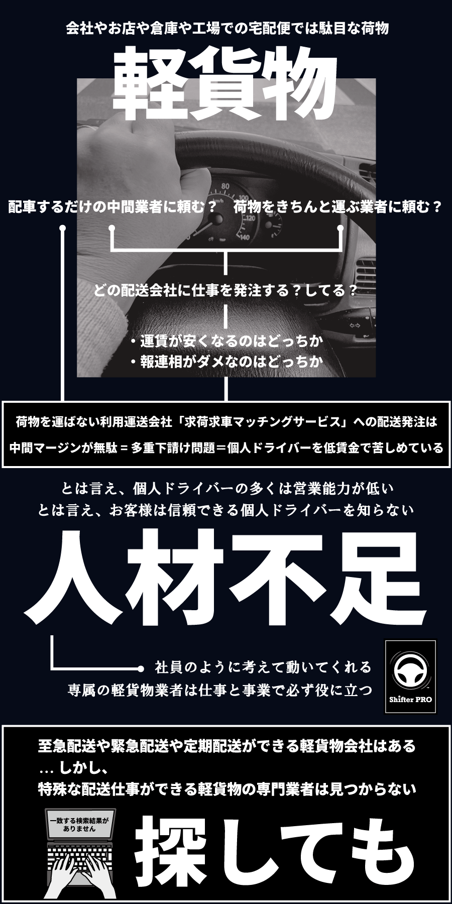 シフタープロ軽貨物便では煩わしい登録手続きをすることなく初めてのお客様からのご依頼もお電話一本で配送仕事のオーダーをダイレクトに承っております。今すぐご利用いただけます。ご依頼の前にお客様側にとっては名前も知らないような運送業者に仕事を頼ん