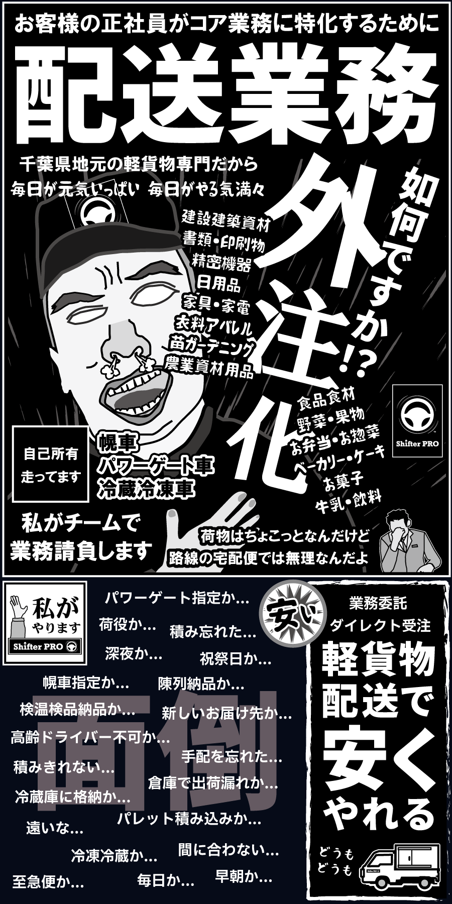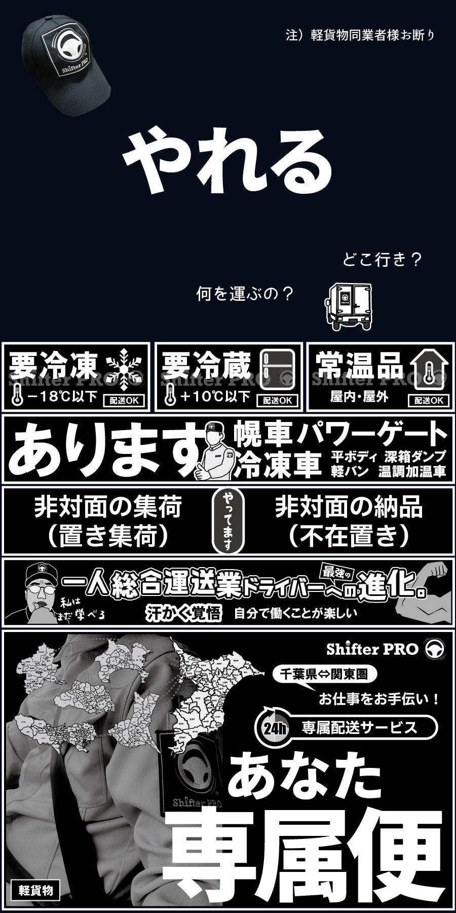 私たち千葉県の軽貨物シフタープロは誰もが知る有名な配送業者ではありませんが軽貨物業界の中では少し特殊な独立系の軽貨物配送業者として、軽貨物のパワーゲート車、軽貨物の冷凍冷蔵車、軽貨物の幌車、軽貨物の移動販売チルド車、軽貨物の温調加温車、軽貨
