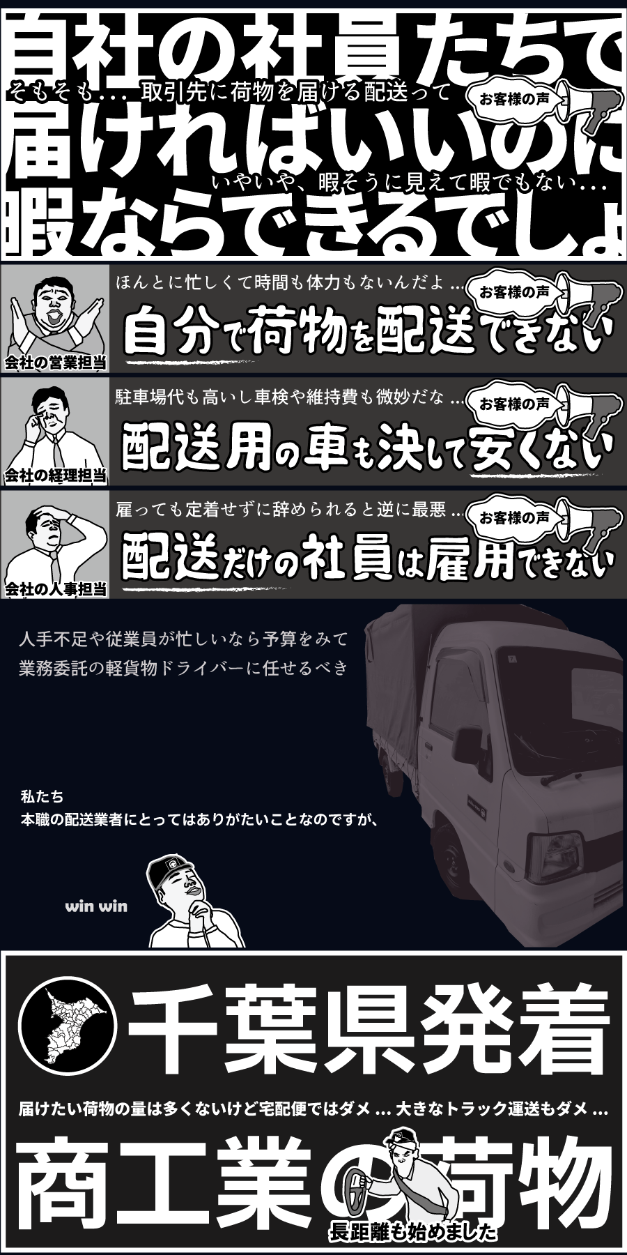 千葉県や関東圏での軽貨物配送に関する各種ご相談は、お客様の会社や倉庫や工場やお店にお伺いして現地訪問でのフェイスtoフェイスミーティングを常時承っております。お気軽にご相談ください。こんなことできますか、すぐ来れますか、運賃交渉できますか、