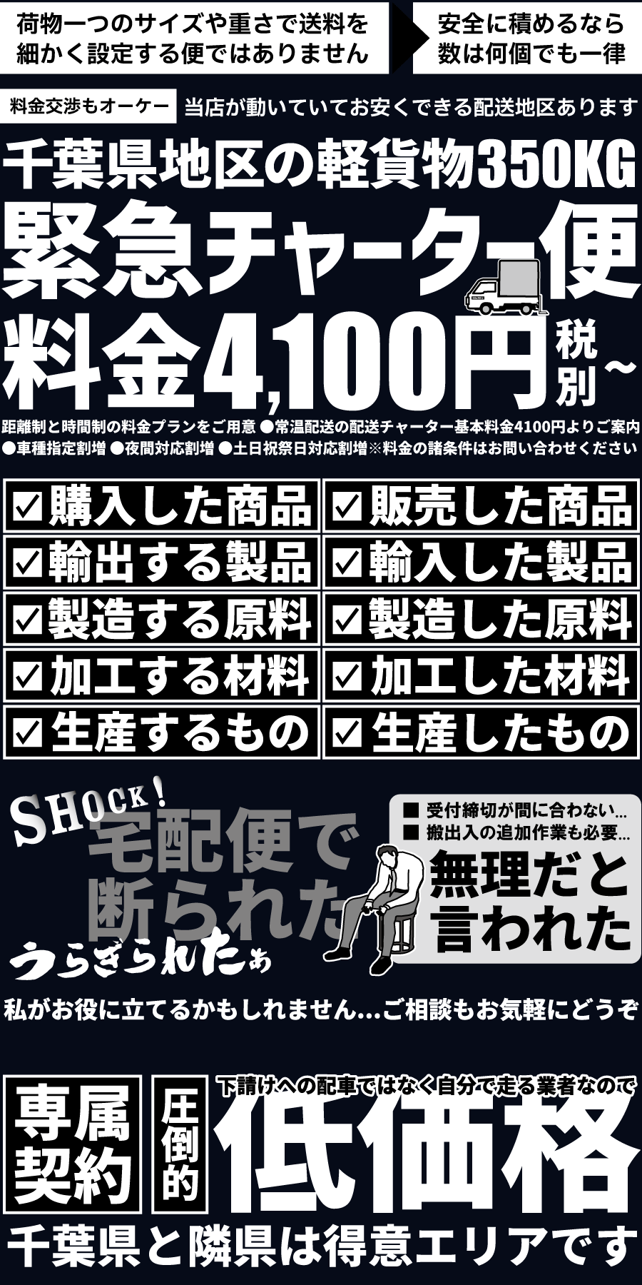 千葉県内や千葉隣県での配送チャーター便は基本送料4,100円税別よりお客様にご案内しております。シフタープロでは荷物を配送するだけでなく陳列配送や搬出入補助や仕分け補助など物流に関わる諸業務の配送附帯業務も承っております。気兼ねなくご相談く
