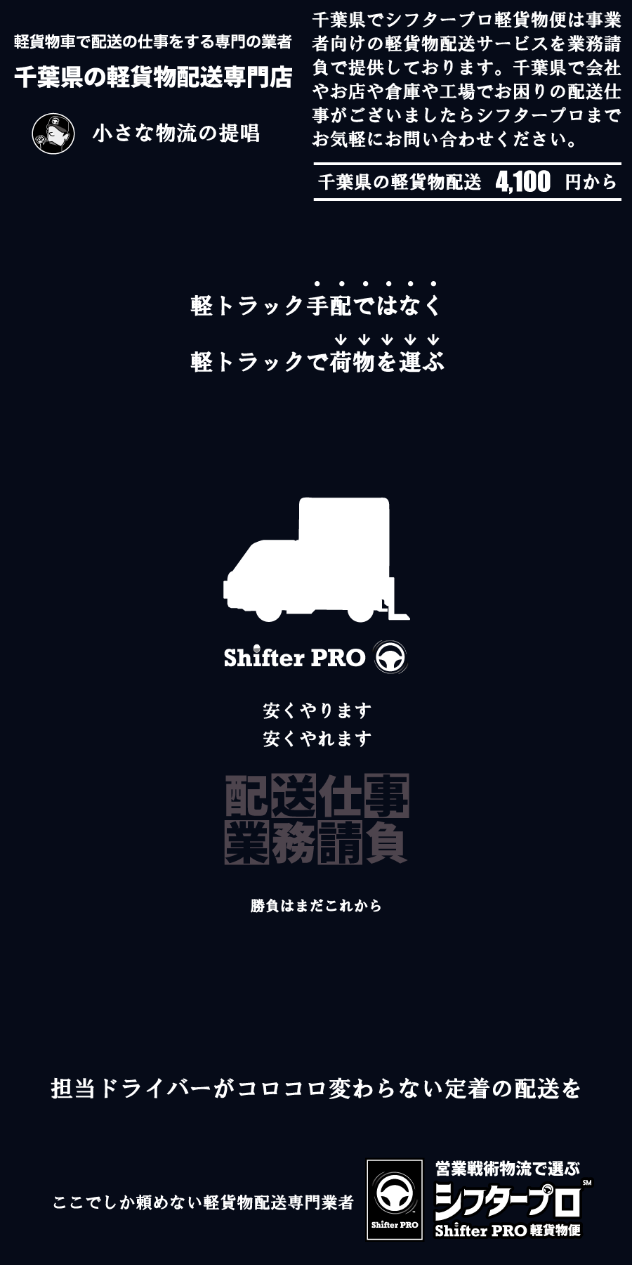 千葉県の軽貨物配送専門店として古き良き時代の小さな運送屋を目指してアナログな親切さのある配送技術研究を進め、千葉県で軽貨物のパワーゲート、幌車、冷蔵冷凍車、平ボディや深箱ダンプや簡易クレーン、移動販売チルド車や温調加温車を自己所有し、多彩で特殊な軽貨物のチャーター便と軽貨物の定期便を得意として個人宅配ではない事業者向けの軽貨物配送サービスとして提供、中間業者を介さず、同業者とは群れず連まずにグループワークではなくチームワークをベースとして、シフタープロ軽貨物便はドライバーファーストではないお客様第一主義の責任稼働体制でお客様から軽貨物配送の仕事を元請けとしてダイレクトに承っております。千葉県全域の軽貨物配送はお気軽にご相談ください。