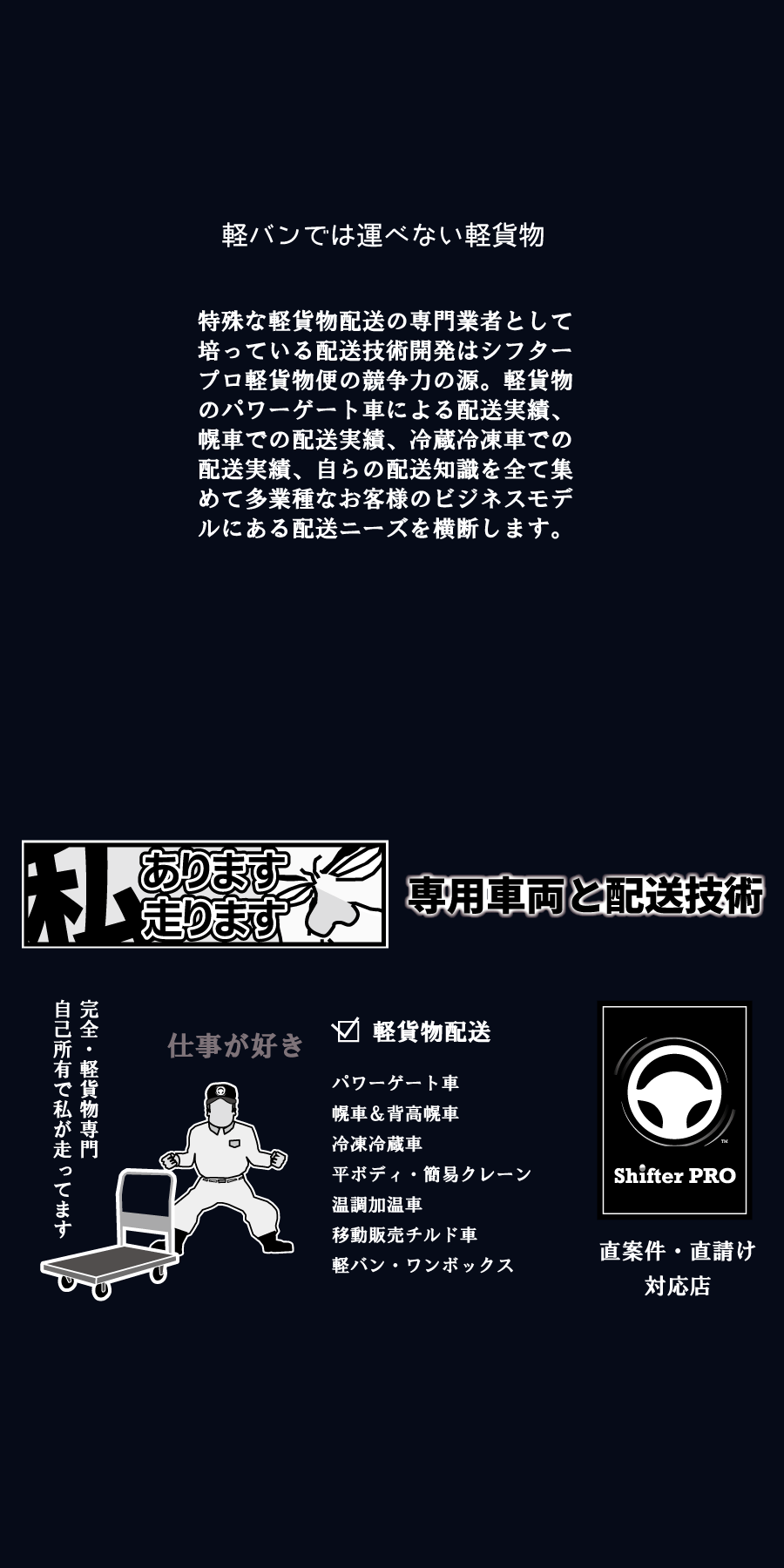 地元の千葉県で営業する軽貨物配送専門店シフタープロは日本の古き良き昭和時代にあった便利な運送屋を目指し、現代の物流では既に失われたり失われつつある昔ながらで日本の高度経済成長期を迎えた昭和時代の運送屋にはあった良さや趣のアナログさと人としての頼もしさ、希薄で面白味のない今日の物流DXとは違って荷主企業のコアビジネス内で属人化を悪としない人として強気の信頼感や親切さのある配送技術とは何かを考え、軽貨物配送サービスの意義を考え直し、配送技術研究を独自に進めながら、千葉県内で軽貨物のパワーゲート車、背の高い高幌車や通常の幌車、低温と中温の冷蔵冷凍車、平ボディ、深箱ダンプ、簡易クレーン、移動販売チルド車、温調加温車、幅広い軽貨物車を自己所有して特殊な軽貨物のチャーター便と軽貨物の定期便を業務請負する立ち回りを得意として、フードデリバリーやネットスーパーや宅配便といった個人宅配の業務ではない事業者向け専用の軽貨物配送サービスを提供し、大手宅配運送会社や軽貨物の利用運送会社などの中間業者を取引で介さずにお客様である荷主企業と直接取引の責任稼働を守り、協会や組合などの馴れ合いな同業者とは群れず、下請けや他力本願な運送グループワークではない自分たちのチームワークを責任稼働のベースとしてシフタープロ軽貨物便はドライバーファーストではないお客様第一主義で前向きな稼働体制を安定構築、小規模な事業運営で一つの取引を大切にし、お客様から軽貨物配送の仕事を元請けする専門業者として千葉県全域を軽貨物車で毎日走っています。是非、機会がありましたら千葉県での軽貨物配送のご相談やご依頼を気軽にいただけると大変嬉しく思います。