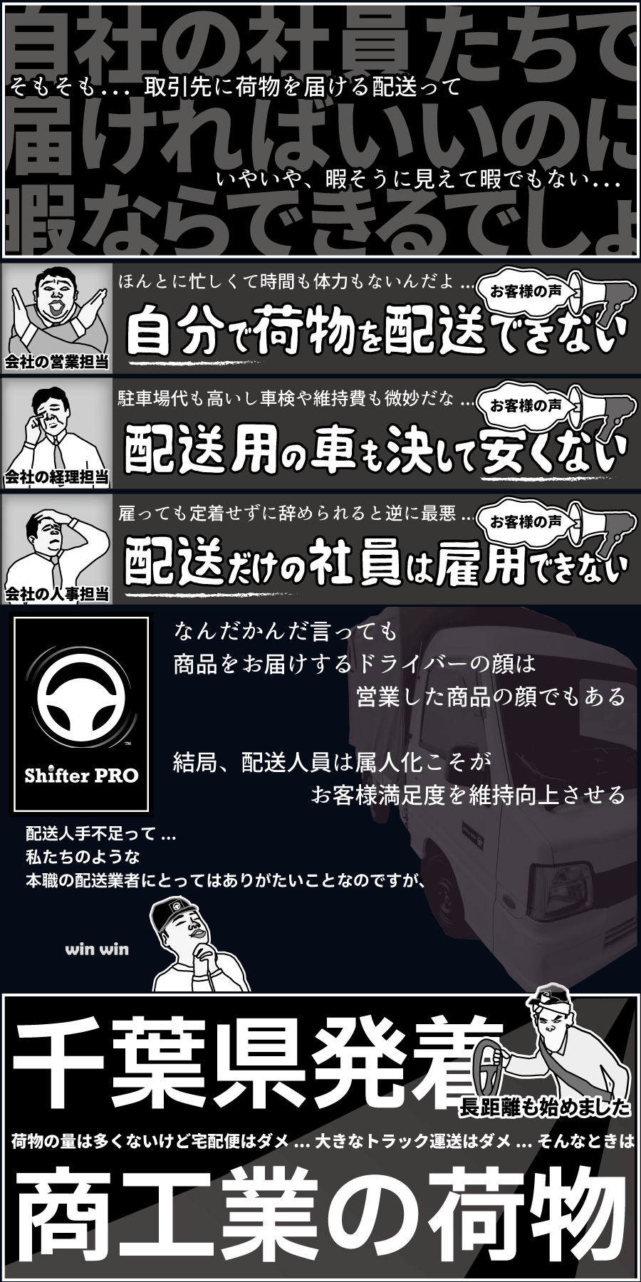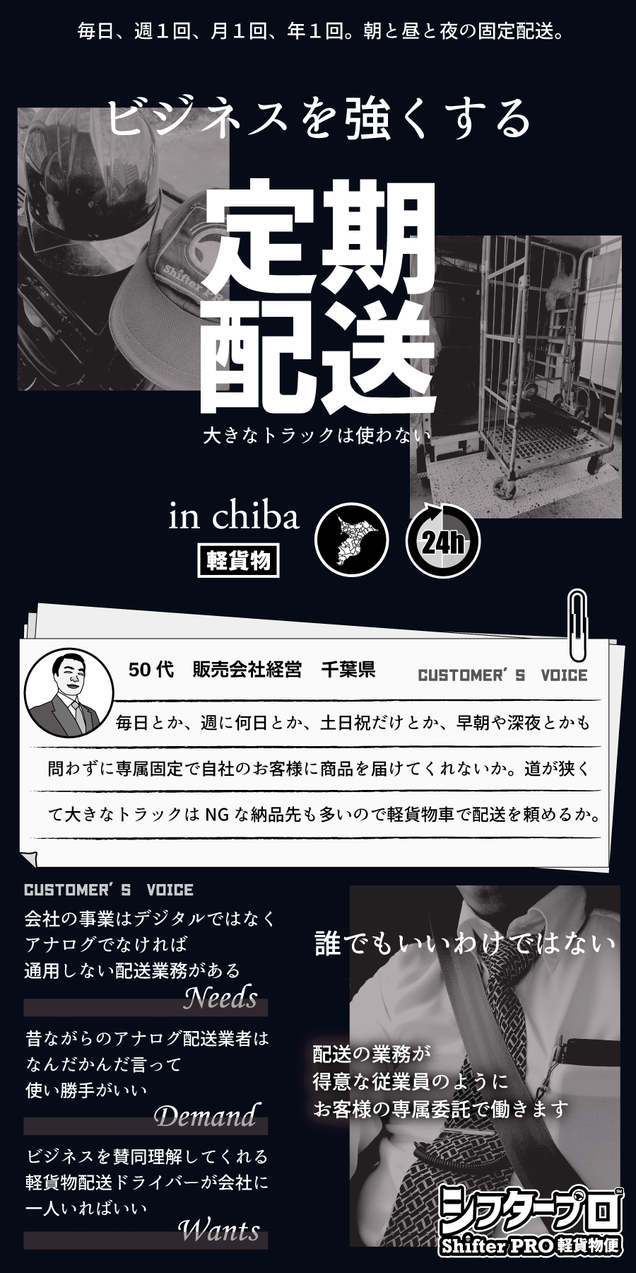 地元の千葉県で営業する軽貨物チャーター配送専門店シフタープロは日本の古き良き昭和時代にあった便利な運送屋を目指し、現代の物流では既に失われたり失われつつある昔ながらで日本が高度経済成長期を迎えた昭和時代の後期から日本がまだギリギリ元気だった平成時代初期の運送屋にはあった良さや趣のアナログさと人としての頼もしさが大切だと信じ、現代の希薄で面白味のない物流DXとは違って荷主企業のコアビジネス内で属人化を悪としない人として強気の信頼感と親切さのある配送技術とは何かを考え、軽貨物配送サービスの意義を考え直して背伸びをしない配送技術研究を独自に進めながら、千葉県内で軽貨物のパワーゲート車、背の高い高幌車や通常の幌車、低温と中温の冷蔵冷凍車、平ボディ、深箱ダンプ、簡易クレーン、移動販売チルド車、温調加温車、幅広い軽貨物車を自己所有して特殊な軽貨物のチャーター便と軽貨物の定期便を業務請負する立ち回りを得意とし、フードデリバリーの宅配やネットスーパーの宅配やネット通販の宅配といった個人宅配の業務ではない事業者向けの荷物や貨物専用の軽貨物配送サービスをお客様に提供しながら、大手宅配運送会社や軽貨物の利用運送会社などの中間業者を取引で介さずにお客様である荷主企業とは直接取引で責任稼働を約束し、協会や組合などの馴れ合いな同業者とは群れず、運送ネットワークという名の多重下請け運送とも連まず、協力会社という下請け他力本願な運送グループワークではない自分たち自身のチームワークを責任稼働キャパシティのベースとし、シフタープロ軽貨物便はドライバーファーストではないお客様第一主義で前向きな共存共苦を乗り越える稼働体制でビジネスを安定構築、小規模な事業運営によって一つの取引を重んじ、お客様から軽貨物配送の仕事を元請けする専門業者として千葉県全域を軽貨物車で毎日走っています。是非、機会がありましたら千葉県での軽貨物配送のご相談やご依頼を声がけいただけると大変嬉しく思います。