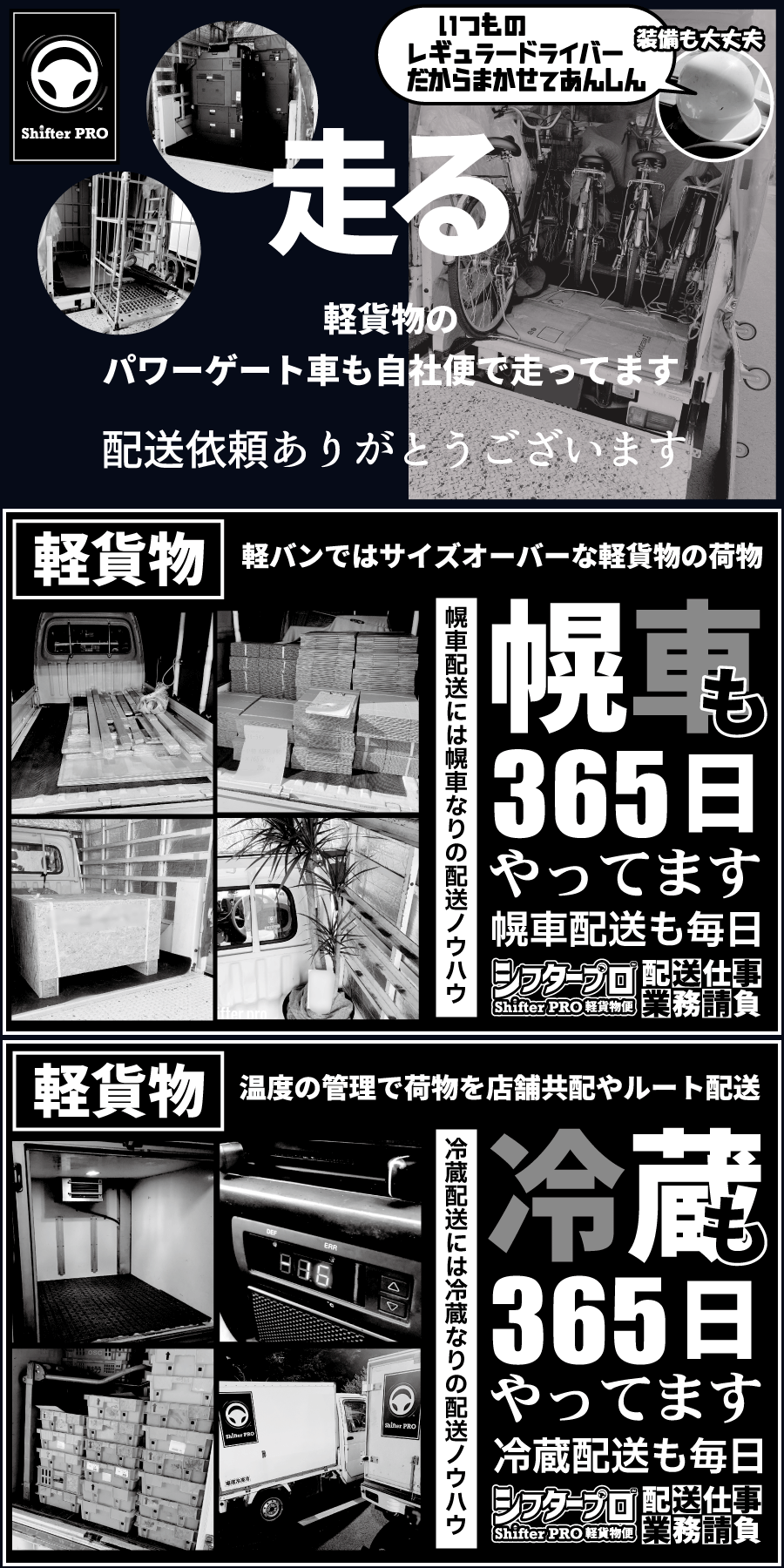 地元の千葉県で営業する軽貨物チャーター配送専門店シフタープロは日本の古き良き昭和時代にあった便利な運送屋を目指し、現代の物流では既に失われたり失われつつある昔ながらで日本が高度経済成長期を迎えた昭和時代の後期から日本がまだギリギリ元気だった平成時代初期の運送屋にはあった良さや趣のアナログさと人としての頼もしさが大切だと信じ、現代の希薄で面白味のない物流DXとは違って荷主企業のコアビジネス内で属人化を悪としない人として強気の信頼感と親切さのある配送技術とは何かを考え、軽貨物配送サービスの意義を考え直して背伸びをしない配送技術研究を独自に進めながら、千葉県内で軽貨物のパワーゲート車、背の高い高幌車や通常の幌車、低温と中温の冷蔵冷凍車、平ボディ、深箱ダンプ、簡易クレーン、移動販売チルド車、温調加温車、幅広い軽貨物車を自己所有して特殊な軽貨物のチャーター便と軽貨物の定期便を業務請負する立ち回りを得意とし、フードデリバリーの宅配やネットスーパーの宅配やネット通販の宅配といった個人宅配の業務ではない事業者向けの荷物や貨物専用の軽貨物配送サービスをお客様に提供しながら多忙であれ仕事があることに感謝をし、大手宅配運送会社や軽貨物の利用運送会社などの中間業者を取引で介さずにお客様である荷主企業とは直接取引で責任稼働を約束して、協会や組合などの馴れ合いな同業者とは群れず、運送ネットワークという名の多重下請け運送とも連まず、協力会社という下請け他力本願な運送グループワークではない自分たち自身のチームワークを責任稼働キャパシティのベースとし、シフタープロ軽貨物便はドライバーファーストではないお客様第一主義で前向きな共存共苦を乗り越える稼働体制で軽貨物配送ビジネスを安定成長構築、小規模な事業運営によって一社との取引を重んじ、お客様から軽貨物配送の仕事を元請けする専門業者として地元でもある千葉県全域を軽貨物車で毎日走っています。是非、機会がありましたら千葉県での軽貨物配送でご相談やご依頼を声がけいただけると大変嬉しく思います。