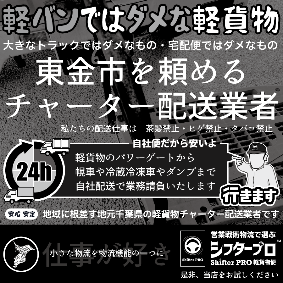 東金市内で大きなトラックで運ぶような荷物や貨物の大きさや量ではなく、軽バンでは無理な軽貨物のチャーター配送うや、宅配便では時間が間に合わない配送、冷凍配送や冷蔵配送、夜間深夜早朝の配送、梱包ができない荷物の配送、土砂で汚れた荷物の配送、お店やネットで買った家具家電などお客様ご自身の乗用車では積めない荷物の配送、大きなトラックでは集荷場所や納品場所での駐停車や道路進入が難しい場所やトラック騒音問題のある閑静な場所での荷物や貨物の搬出入など、シフタープロでは幅広い種類を自己所有する軽貨物車の配送技術を駆使した緊急や至急のチャーター便や曜日固定の定期便を承っております。シフタープロが業務で使用する車両は一般的な軽貨物運送業者が使用している軽バンではなく、パワーゲート高幌車、幌車での軽貨物配送、冷蔵冷凍車、移動販売チルド車、平ボディや深箱ダンプでの軽貨物配送も全て自社便で配送業務をお客様から直接受付しています。東金市での共配などルート配送、お店や工場や倉庫での待機便、トラック荷役補助、陳列配送、鍵開け格納、代引き配送、オリコン回収など、配送附帯業務も気兼ねなくご相談ください。