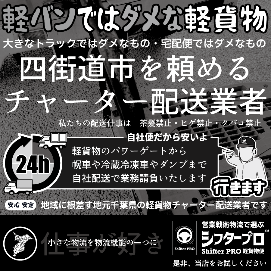 四街道市内で大きなトラックで運ぶような荷物や貨物の大きさや量ではなく、軽バンでは無理な軽貨物のチャーター配送うや、宅配便では時間が間に合わない配送、冷凍配送や冷蔵配送、夜間深夜早朝の配送、梱包ができない荷物の配送、土砂で汚れた荷物の配送、お店やネットで買った家具家電などお客様ご自身の乗用車では積めない荷物の配送、大きなトラックでは集荷場所や納品場所での駐停車や道路進入が難しい場所やトラック騒音問題のある閑静な場所での荷物や貨物の搬出入など、シフタープロでは幅広い種類を自己所有する軽貨物車の配送技術を駆使した緊急や至急のチャーター便や曜日固定の定期便を承っております。シフタープロが業務で使用する車両は一般的な軽貨物運送業者が使用している軽バンではなく、パワーゲート高幌車、幌車での軽貨物配送、冷蔵冷凍車、移動販売チルド車、平ボディや深箱ダンプでの軽貨物配送も全て自社便で配送業務をお客様から直接受付しています。四街道市での共配などルート配送、お店や工場や倉庫での待機便、トラック荷役補助、陳列配送、鍵開け格納、代引き配送、オリコン回収など、配送附帯業務も気兼ねなくご相談ください。