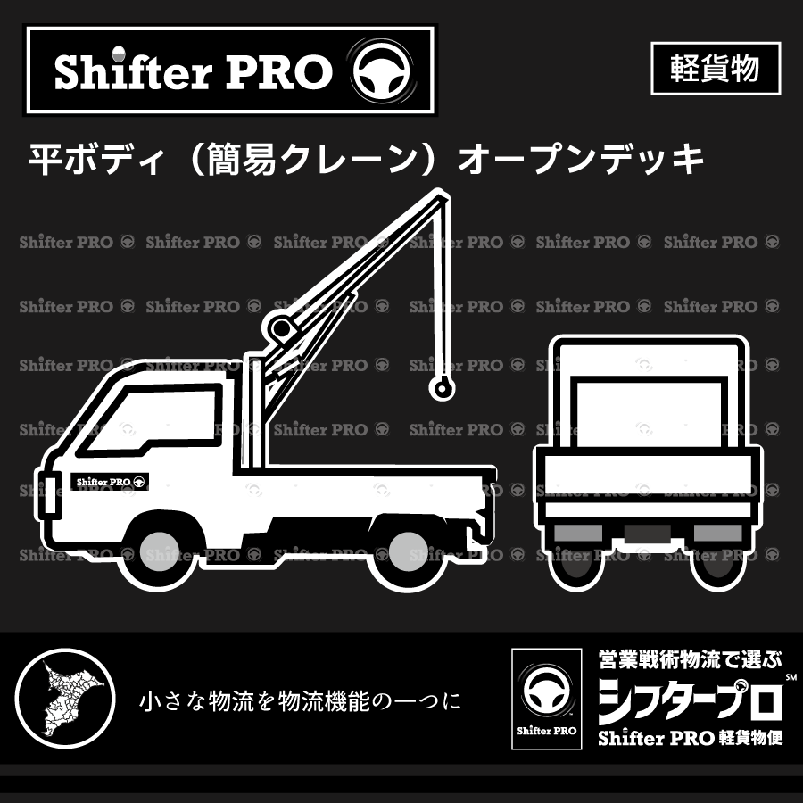 平ボディ(軽貨物)をシフタープロで自己所有しております。千葉県と千葉隣県のエリアで平ボディを使ったチャーター配送業務に対応しています。