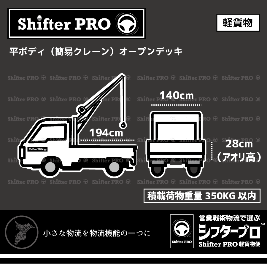 平ボディ(軽貨物)をシフタープロで自己所有しております。千葉県と千葉隣県のエリアで平ボディを使ったチャーター配送業務に対応しています。