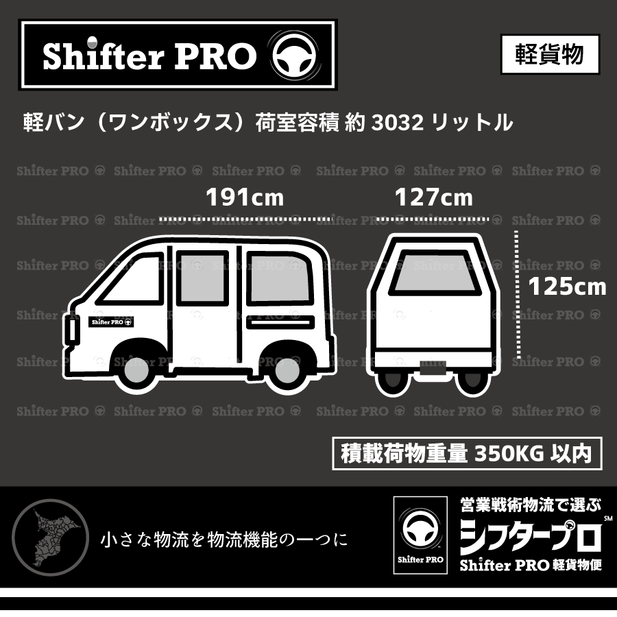 23/軽バン(ワンボックス) 2018.10.20 軽バンを使う配送 軽バン(軽貨物)をシフタープロで自己所有しております。千葉県と千葉隣県で軽バンを使ったチャーター配送業務に対応しています。 主に、段ボール梱包の荷物、オリコンの荷物、常温配送が可能です。1便は合計350kgまでとなります。