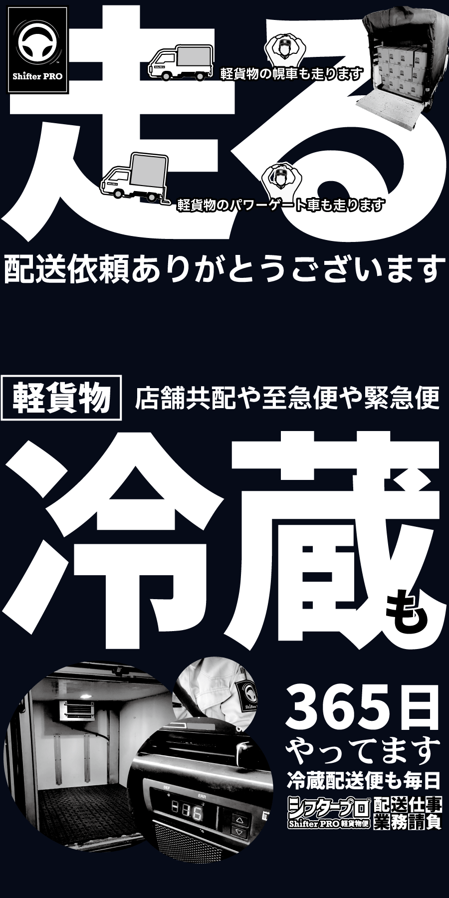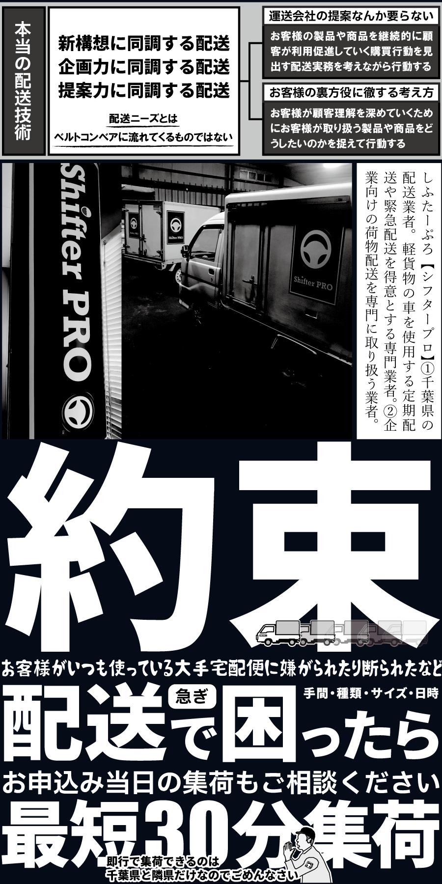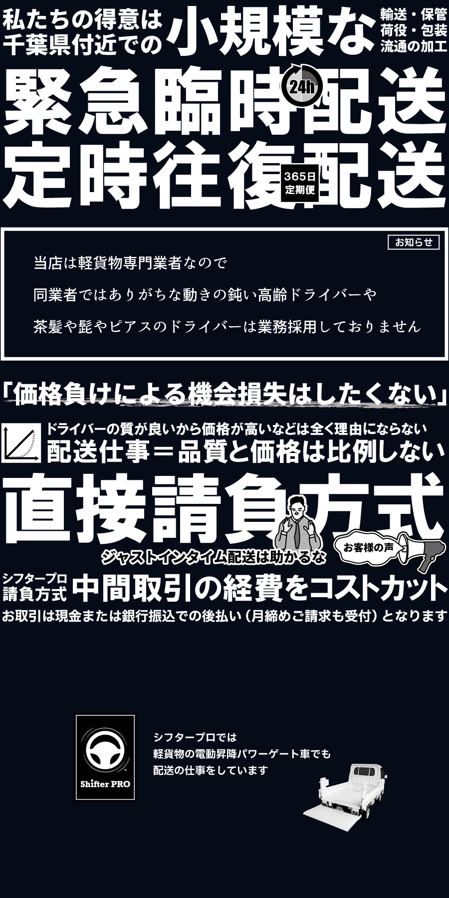 私たちシフタープロは誰もが知る有名な配送業者ではありませんが軽貨物業界では特殊な完全独立系の配送業者として、軽貨物のパワーゲート車や冷凍冷蔵車や幌車や平ボティや軽バンまで自己所有する業務専用軽貨物車を駆使したマルチな配送技術と配送ニーズ対応のノウハウを持って企業向けの軽貨物配送業務請負に特化した営業をしています。シフタープロは軽貨物配送専門の業者ですが宅配系ドライバー業者ではありません。同業者の大半が業務しているネット通販商品の個人宅配やネットスーパー販売商品の個人宅配や大手宅配会社の宅配便といった宅配仕事は請負せず、ダイレクトに多業種の荷主企業と物流企業に於ける特殊な配送ニーズを元請けする千葉県の地元軽貨物配送業者として、大手宅配会社や名のある軽貨物会社のようなキャパオーバーでも何でもかんでも配送仕事をお客様から受注して自社では荷物すら触らずに下請け探しをして右から左に仕事案件を多重下請け構造へ丸投げ配車して末端の個人ドライバー見つけが仕事業務となっているような荷物を運ばない配車会社ではなく、当店は自らの手でお客様の荷物を運び、自らが軽貨物車のハンドルを握り、配送現場を実際に足を使っ