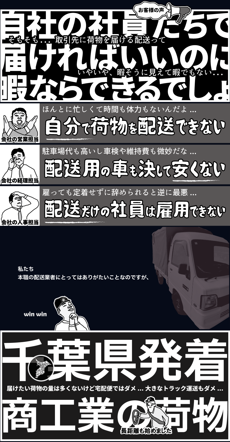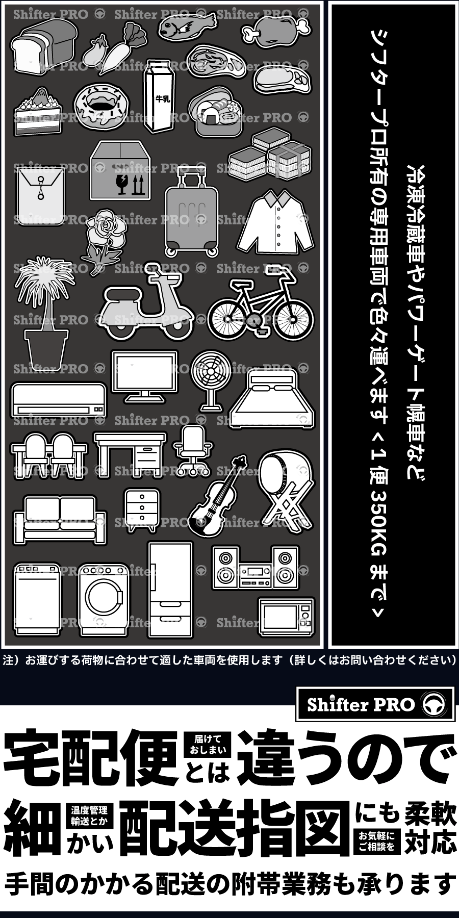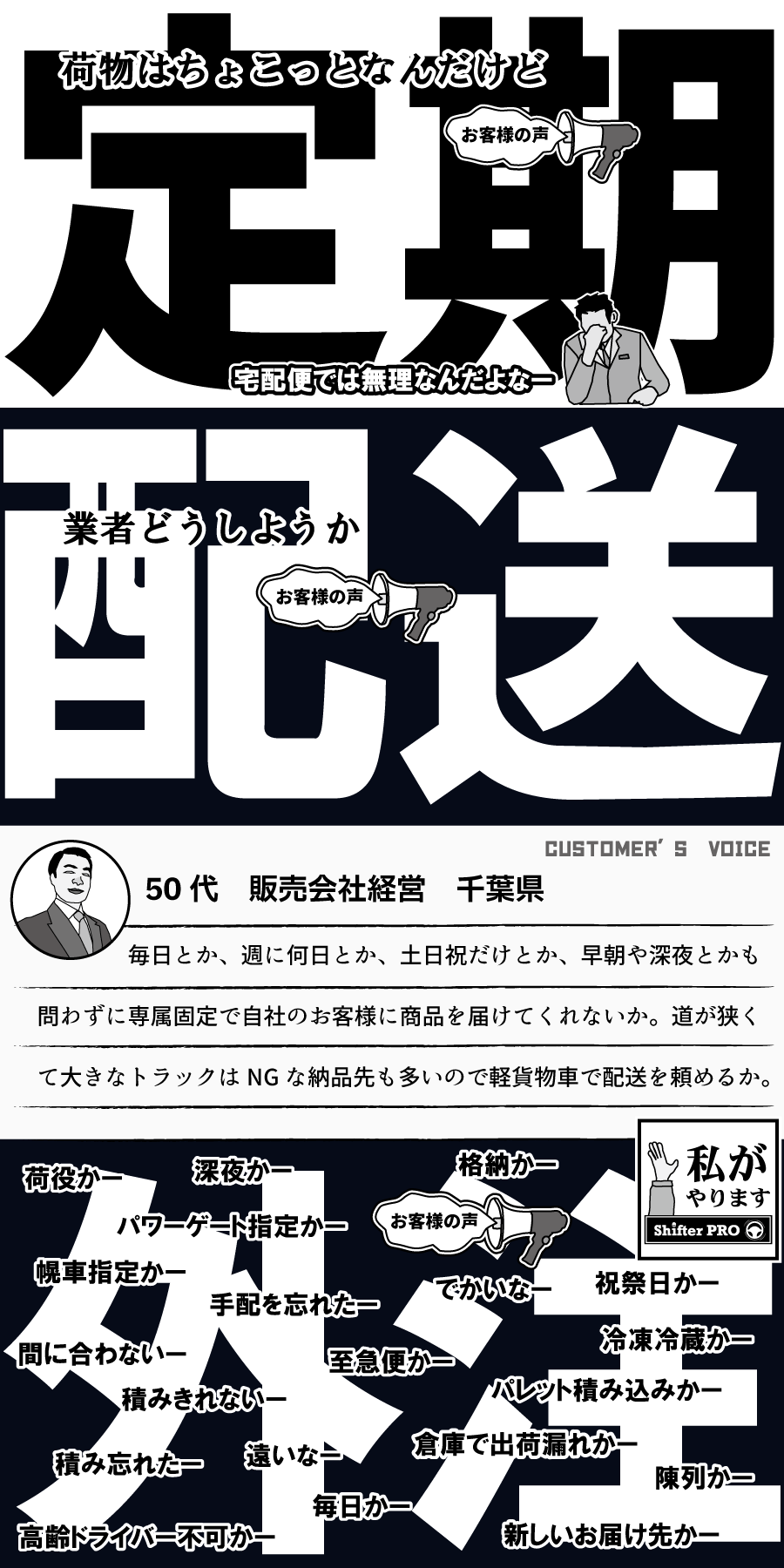 私たちシフタープロは誰もが知る有名な配送業者ではありませんが軽貨物業界では特殊な完全独立系の配送業者として、軽貨物のパワーゲート車や冷凍冷蔵車や幌車や平ボティや軽バンまで自己所有する業務専用軽貨物車を駆使したマルチな配送技術と配送ニーズ対応のノウハウを持って企業向けの軽貨物配送業務請負に特化した営業をしています。シフタープロは軽貨物配送専門の業者ですが宅配系ドライバー業者ではありません。同業者の大半が業務しているネット通販商品の個人宅配やネットスーパー販売商品の個人宅配や大手宅配会社の宅配便といった宅配仕事は請負せず、ダイレクトに多業種の荷主企業と物流企業に於ける特殊な配送ニーズを元請けする千葉県の地元軽貨物配送業者として、大手宅配会社や名のある軽貨物会社のようなキャパオーバーでも何でもかんでも配送仕事をお客様から受注して自社では荷物すら触らずに下請け探しをして右から左に仕事案件を多重下請け構造へ丸投げ配車して末端の個人ドライバー見つけが仕事業務となっているような荷物を運ばない配車会社ではなく、当店は自らの手でお客様の荷物を運び、自らが軽貨物車のハンドルを握り、配送現場を実際に足を使っ