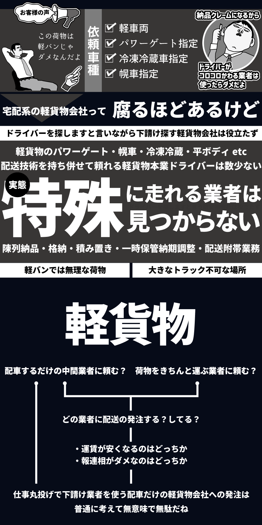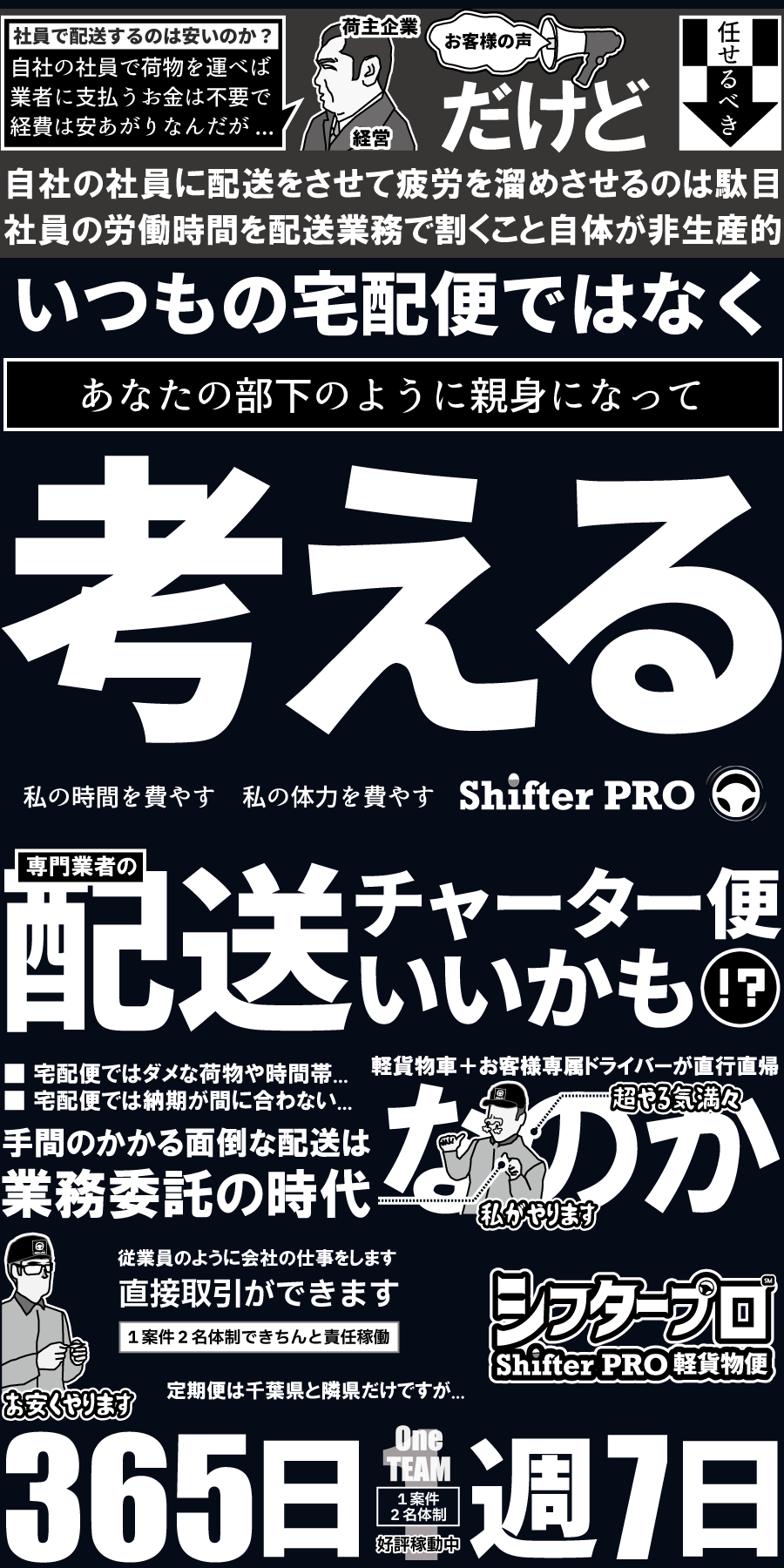 私たちが考え続けている軽貨物ドライバー業者としての大切な配送技術というものは、配送ドライバーの質や配送ドライバーの運転テクニックや配送ドライバー経験の年数や配送スピードなどの配送ドライバーとしてのプロフェッショナルさでもありません。独立系の軽貨物業者として追求すべきことは、配送ドライバーの数でもなく、街中にある軽貨物会社の経営者が口にするような配送ドライバーの教育制度なども自慢にならない自慢話に過ぎません。お客様のビジネスを大切に考えるノウハウこそがとても重要な配送技術だとシフタープロでは捉えています。お客様のための配送技術ご縁のある荷主企業が利益を出そうとしているビジネスの中に存在する物流ニーズにフィットできる思考への順応性、物流イレギュラーに反発しない適応力のある動き方、これらで荷主企業の営業部門と物流部門をうまくリンクさせて荷主企業を繁盛させることが軽貨物ドライバー業者にとって本当の配送技術です。真心も運びません。安心や安全も運びません。信頼も笑顔も絆も運びません。私たちが運ぶのは荷物です。これ以上もこれ以下もありません。大手宅配会社ドライバーあがり系の軽貨物会社経営者にありがち
