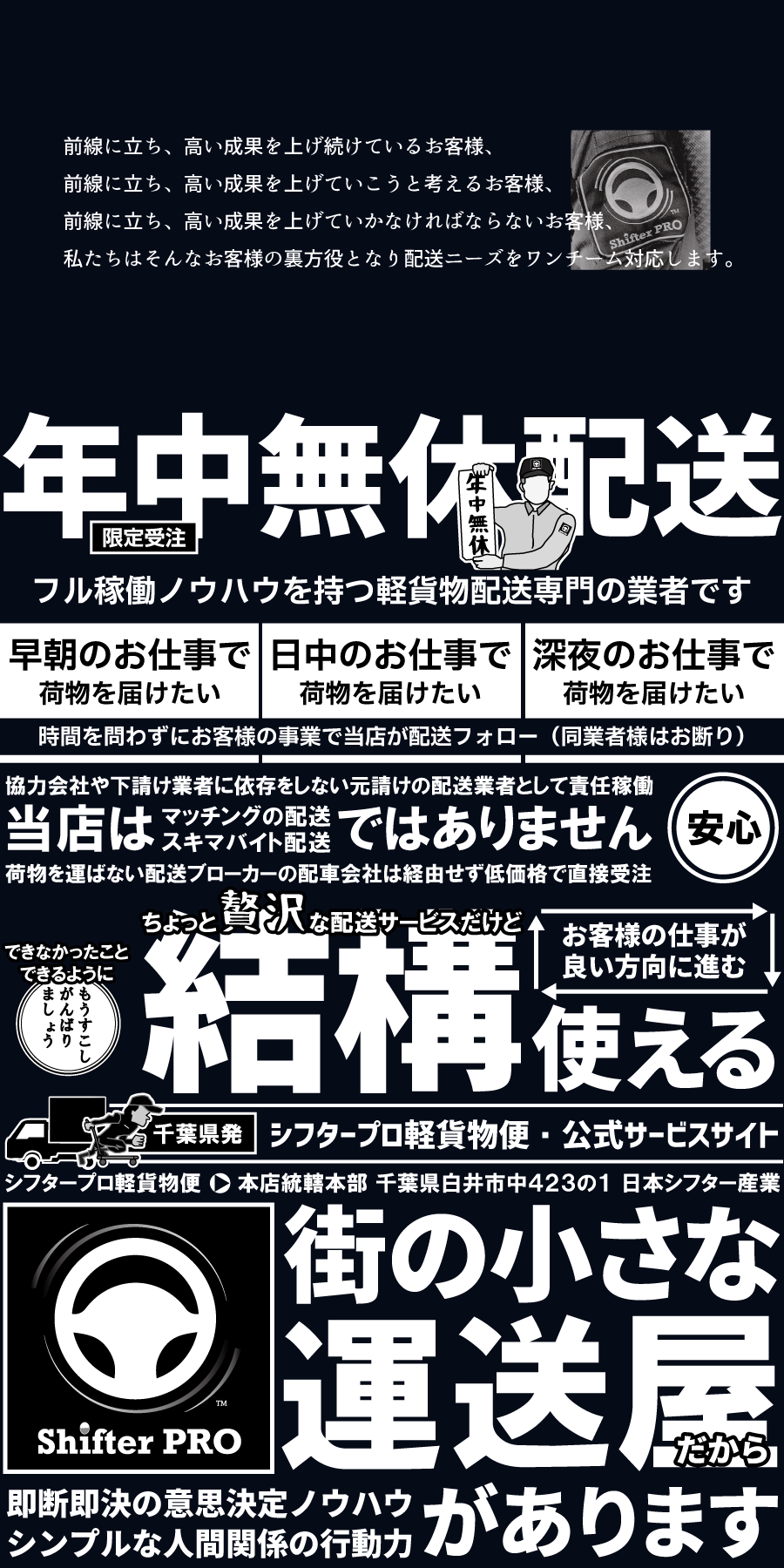 屋号日本シフター産業(SHIFTER-JAPAN)連絡先電話 09044382204(24時間常時対応)、ファックス 0474130487(24時間常時閲覧対応)メールsupport@shifter-japan.com代表者営業統轄責任者:関本部所在地千葉県白井市中423-1事業内容軽貨物配送(専業)コーポレートサイト営業時間帯相談受付 8:00-20:00(月から金曜日)稼働時間帯年中無休365日24時間体制CI考えられた配送(小さな物流の提唱)所有車両パワーゲート車(軽貨物)、幌車(軽貨物)、冷凍冷蔵車(軽貨物)、ダンプ(軽貨物)、移動販売チルド車(軽貨物)、温調加温車(軽貨物)、簡易クレーン(軽貨物)、平ボディ(軽貨物)、軽バン(軽貨物)協業店シフタープロ千葉店、シフタープロ神奈川店、シフタープロ東京店、シフタープロ埼玉店