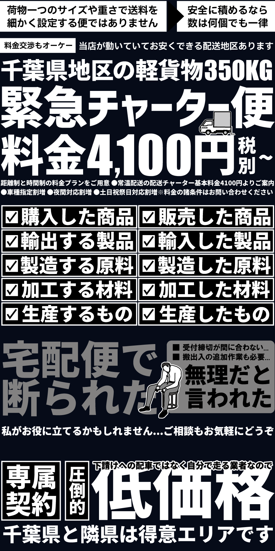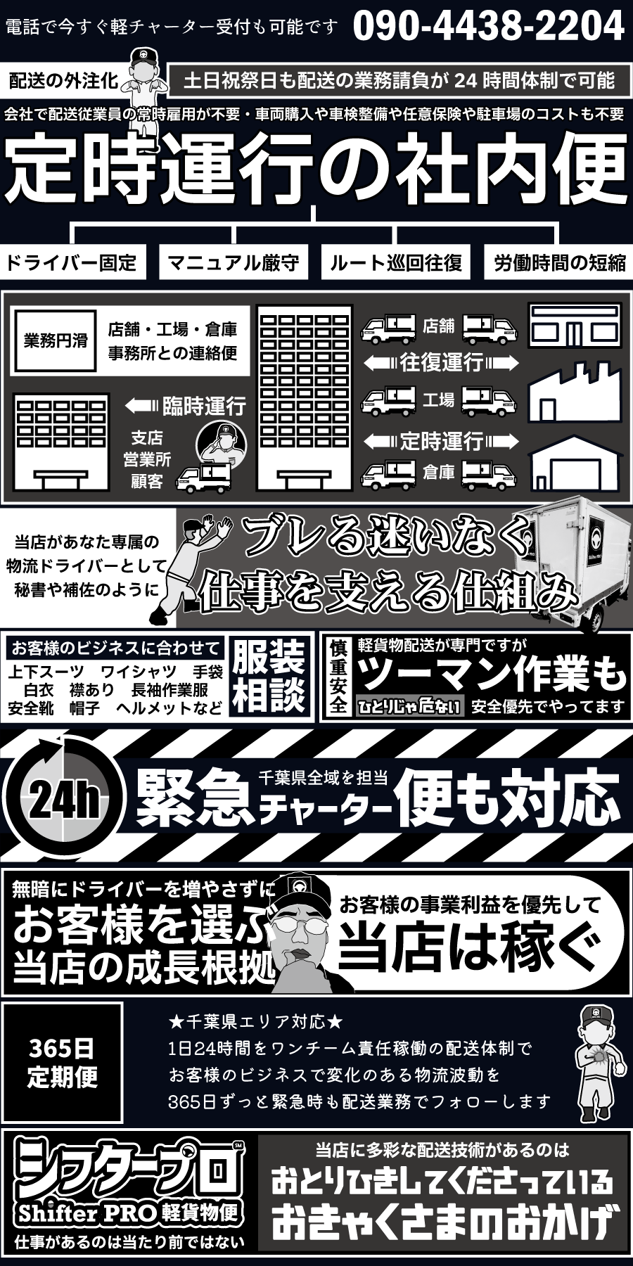 千葉県内や千葉隣県の配送チャーター便は基本送料4,100円税別よりお客様にご案内しております。シフタープロでは荷物を配送するだけでなく陳列配送や物流に関わる諸業務の配送附帯業務も承っております。気兼ねなくご相談ください。シフタープロ軽貨物便は、冷蔵便、加温便、移動販売チルド便、幌車便、パワーゲート便、平ボディ便、ダンプ便、軽バン便、の配送業務をシフタープロ自己所有の専用車両で実務対応しています。荷物の個数請求ではない通常、送料の取り決めはお預かりする荷物の個数制ではなく距離制の送料または時間制の送料を実際の配送内容ごとに料金の提示を致します。軽貨物車によるスポット配送契約と定期配送契約を承ります。どこからどこまで、何時から何時まで、荷物の種類、附帯業務の有無など、気兼ねなくご相談ください。冷蔵便も幌車便もパワーゲート便も移動販売チルド便もダンプ便も平ボディ便も軽バン便もシフタープロ軽貨物便で独自に対応可能です。当店倉庫(千葉県白井市)で配送荷物一時保管による納期調整便、前日夕方集荷で翌日早朝納品の前日積み置き便の附帯業務も承ります。納期調整便と積み置き便のオプション料金は1パレット単位