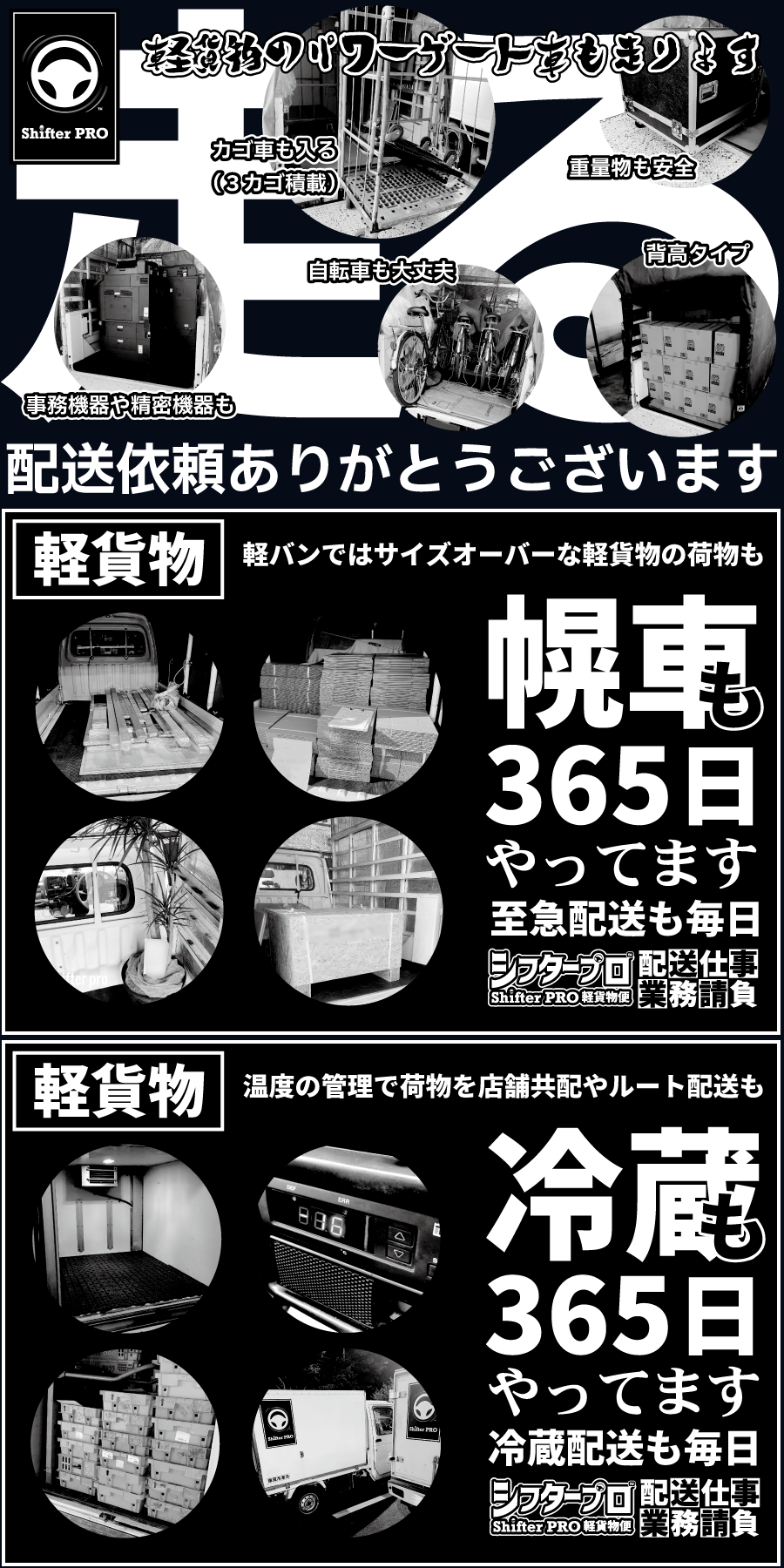 屋号日本シフター産業(SHIFTER-JAPAN)連絡先電話 09044382204(24時間常時対応)、ファックス 0474130487(24時間常時閲覧)メールsupport@shifter-japan.com代表者営業統轄責任者:関本部所在地千葉県白井市中423-1事業内容軽貨物配送(専業)コーポレートサイト営業時間帯相談受付 8:00-20:00(月から金曜日)稼働時間帯年中無休365日24時間体制CI考えられた配送(小さな物流の提唱)所有車両パワーゲート車(軽貨物)、幌車(軽貨物)、冷凍冷蔵車(軽貨物)、ダンプ(軽貨物)、移動販売チルド車(軽貨物)、温調加温車(軽貨物)、簡易クレーン(軽貨物)、平ボディ(軽貨物)、軽バン(軽貨物)協業店シフタープロ千葉店、シフタープロ神奈川店、シフタープロ東京店、シフタープロ埼玉店