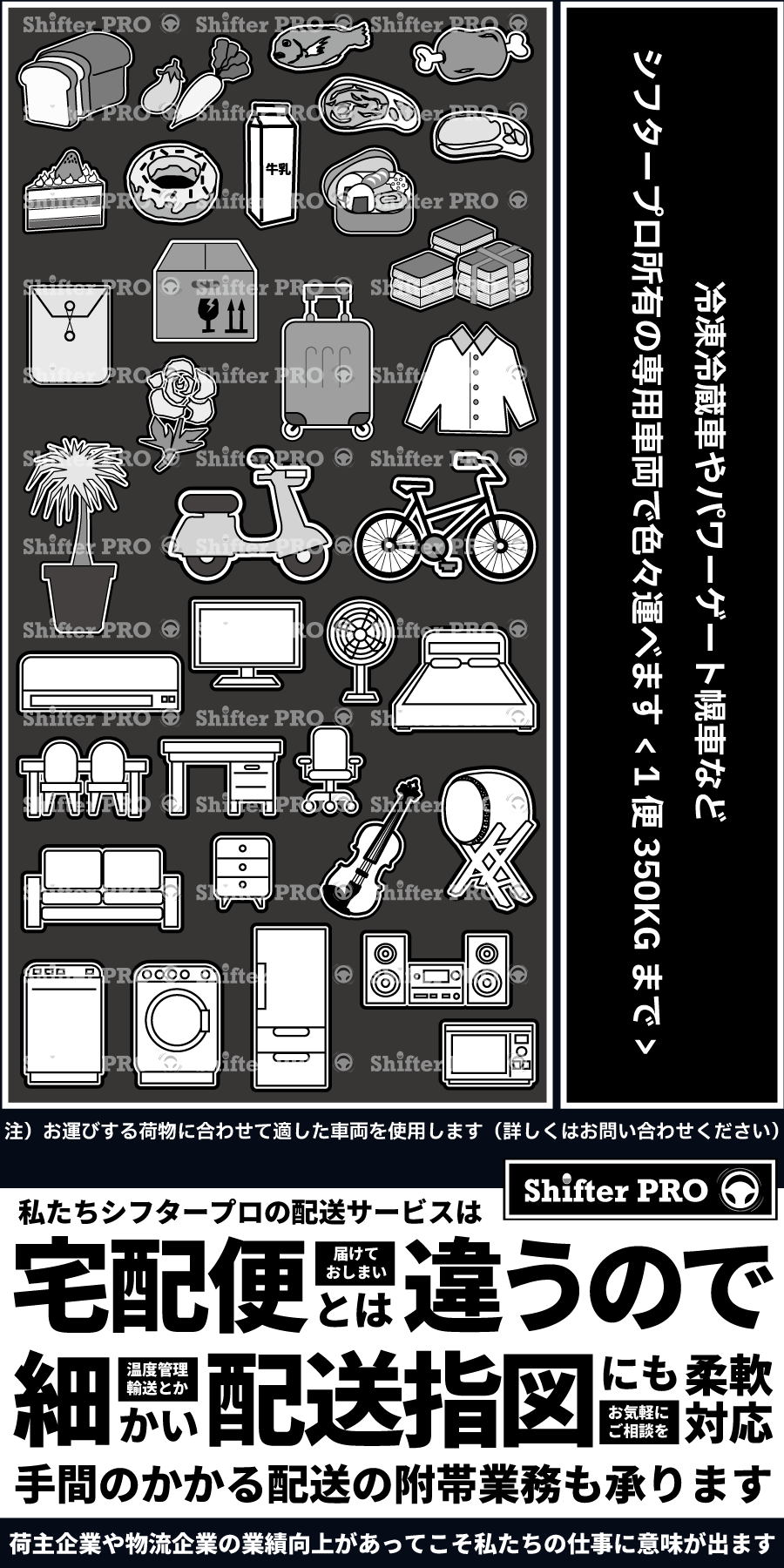 私たち千葉県の軽貨物シフタープロは誰もが知る有名な配送業者ではありませんが軽貨物業界の中では少し特殊な完全独立系の配送業者として、軽貨物のパワーゲート車や冷凍冷蔵車や幌車や平ボティや簡易クレーンや軽バンなどを自己所有して各々の業務専用軽貨物車を駆使したマルチな配送技術で事業者向けの配送ニーズに対応するノウハウを持って軽貨物配送の業務請負に完全特化した作業と仕事の営業展開を千葉県軸の首都圏で行なっております。千葉県の軽貨物シフタープロは軽貨物配送の専門業者ですが宅配系ドライバー業者ではありません。街中にある軽貨物の同業者様はその大半が業務しているネット通販商品の個人宅配やネットスーパー販売商品の個人宅配や大手宅配会社の宅配便といった宅配仕事をシフタープロでは請負しておりません。千葉県軸と首都圏でダイレクトに多業種の荷主企業と物流企業に於ける特殊な配送ニーズを元請けする千葉の地元軽貨物配送業者として事業拡大の背伸びをせず的確に動き、大手宅配会社や名のある軽貨物会社のような稼働キャパオーバーであろうと何でもかんでも配送仕事をお客様から受注をして自社では荷物すら見ないで触りもせずで下請けの軽貨
