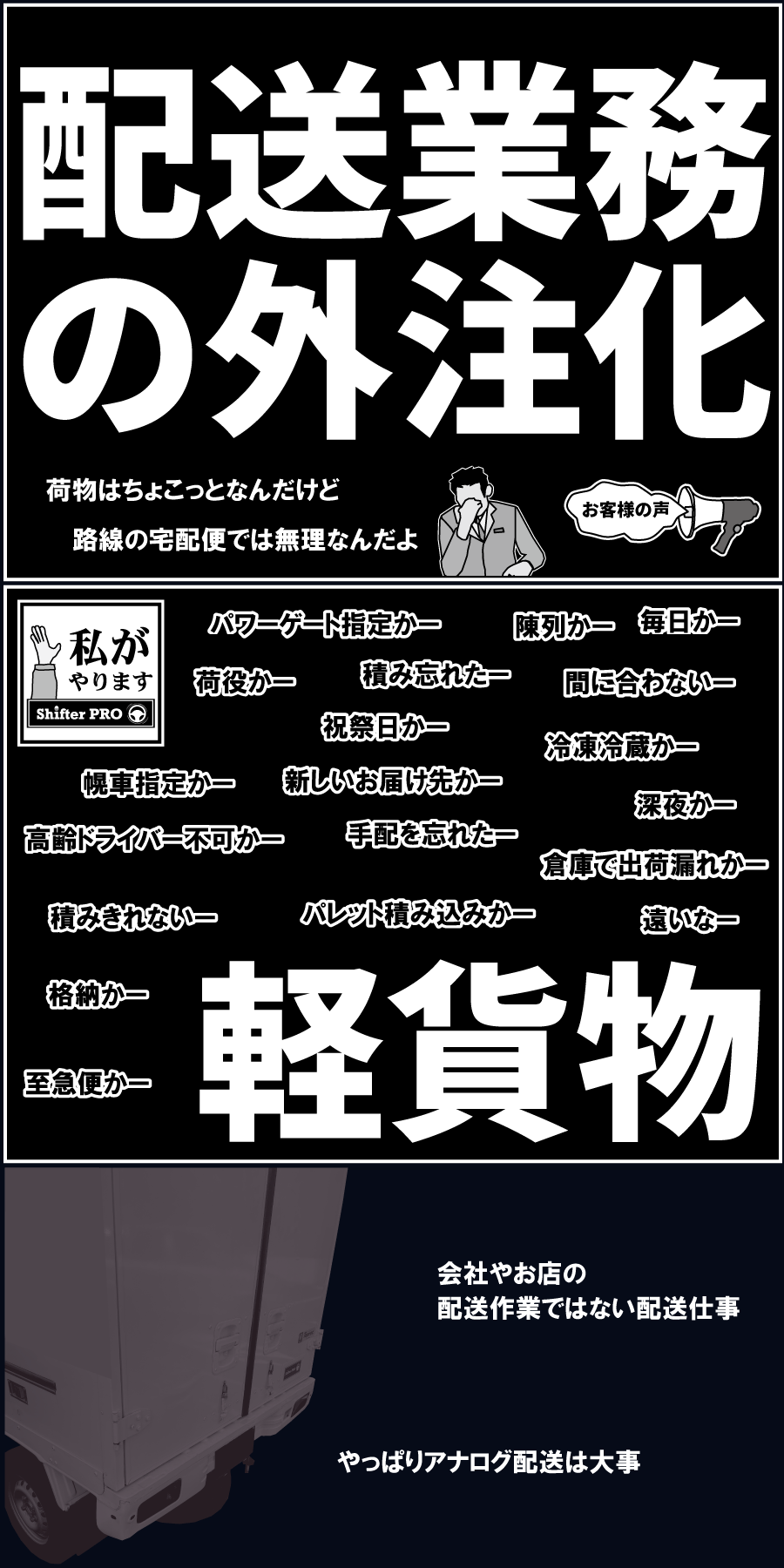 小さな物流のご相談はお客様の倉庫や工場やお店やオフィスへお伺いして現地訪問でのミーティングも常時承っております。こんなことできますか、すぐ来れますか、運賃交渉できますか、など気兼ねなくお問い合わせください。小さな物流の構築で阿吽の呼吸での配送実務を確立させます。無料配送相談シフタープロ軽貨物便千葉県白井市中423-1日本シフター産業tel:09044382204fax:0474130487mail:support@shifter-japan.com相談受付:8:00から20:00緊急配送:24時間対応公式LINEアカウント: