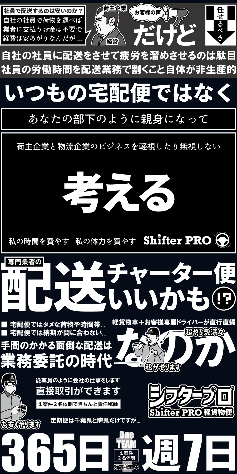千葉県の軽貨物シフタープロが事業展開で集中していることは荷主企業と物流企業のビジネスを中長期で応援する裏方役の立場で働くことです。主役はお客様です。ドライバーファーストではありません。物流を小さく考える小さな規模で事業をしておりますのでご縁ある取引先の事業繁栄を考えながらお客様専属ドライバー業者として定着し、関東圏で配送チャーター便の仕事実績を積み重ねているシフタープロ軽貨物運送事業の軌跡をリアルにブログで公開しています。