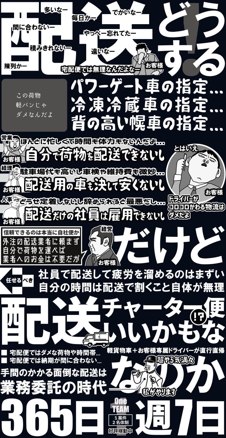 実際、軽貨物の配送技術というのは配送ドライバーの質や配送ドライバーの運転テクニックや配送ドライバーの経験年数や配送スピードではありません。当然ですが配送ドライバーの数でもありません。配送ドライバーの教育制度でもありません。お客様のための配送技術荷主企業が利益を出そうとするビジネスにある物流ニーズにフィットできる柔軟性と適応力のある動き方で荷主企業の営業部門と物流部門をうまくリンクさせて荷主企業を繁盛させることが本当の配送技術だと小さな物流を大切するシフタープロでは考えています。真心も運びません。安心や安全も運びません。信頼も笑顔も絆も運びません。軽貨物会社にありがちな真心を運ぶとか、安心や安全を運ぶとか、信頼や笑顔や絆を運ぶとか、そのような取って付けたエゴでは無く、事業系配送の原点、荷主企業に於ける事業課題と配送問題に対するアプローチのノウハウを磨き、お客様の大切な荷物であろうと大切ではない荷物であろうとも依頼主の代わりに荷物を指図されたとおりに依頼主のお客様や受取人に荷物を運び届けることをシンプルにシフタープロ軽貨物便はワンチームで専念をします。配送技術と配送技能当日チャーター便の配