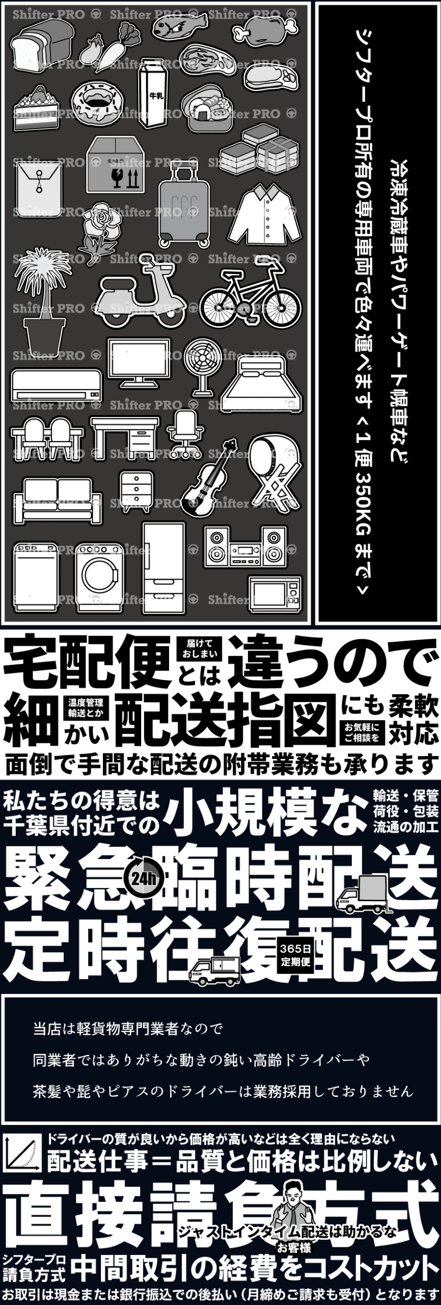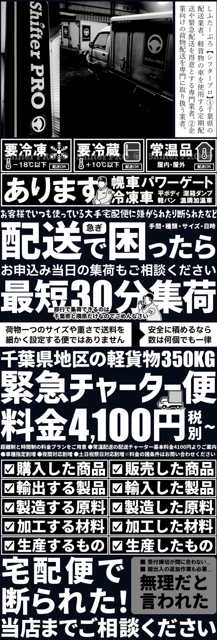 シフタープロ軽貨物便は千葉県の全域で1便350kgまでの荷物の当日便、緊急配送チャーターを365日24時間の年中無休ワンチーム責任稼働体制で業務受付しています。早朝も深夜も業務対応お急ぎのお客様は早朝や深夜の時間を問わずに空車確認のお電話をください。可能な限り即行動をいたします。シフタープロとの取引がはじめてのお客様も不明な点や心配な点は気兼ねなくお電話やメールやLINEなどでもお問い合わせください。土日祝祭日も稼働中土日祝祭日や深夜も早朝も便は動いています。当店の配送サービスは事業者向けですが個人様でも対応できる場合がございます。ご相談ください。シフタープロ軽貨物便では、軽貨物の冷凍冷蔵車、ダンプ、幌車、パワーゲート、平ボディ、温調加温車、軽バン、移動販売チルド車、荷主企業の細かな物流ニーズに合わせた専用の軽貨物車を自己所有しております。定期契約では年に一回や月に一回や週に一回、毎日365日の配送業務や曜日固定の契約で荷主企業のお客様の専属で働くスタッフのような配送チャーター便としてご利用いただいております。土日祝も対応新規取引歓迎千葉県と隣県千葉県地区の配送千葉県地区の企業間物流チ