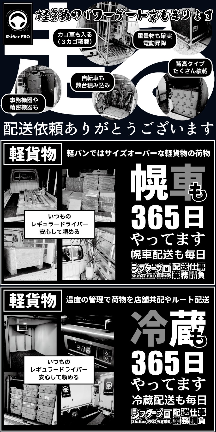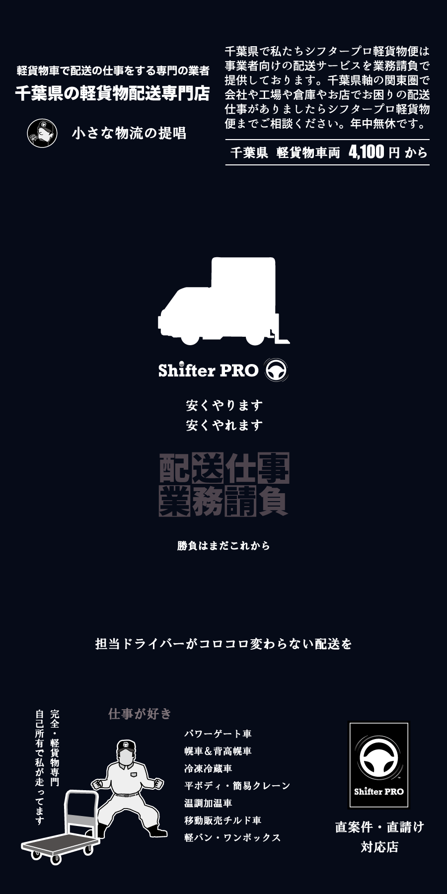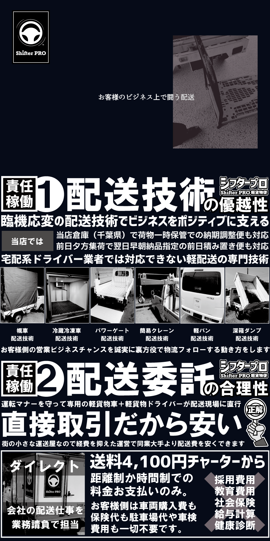 私たち千葉県の軽貨物シフタープロは誰もが知る有名な配送業者ではありませんが軽貨物業界の中では少し特殊な独立系の軽貨物配送業者として、軽貨物のパワーゲート車、軽貨物の冷凍冷蔵車、軽貨物の幌車、軽貨物の移動販売チルド車、軽貨物の温調加温車、軽貨