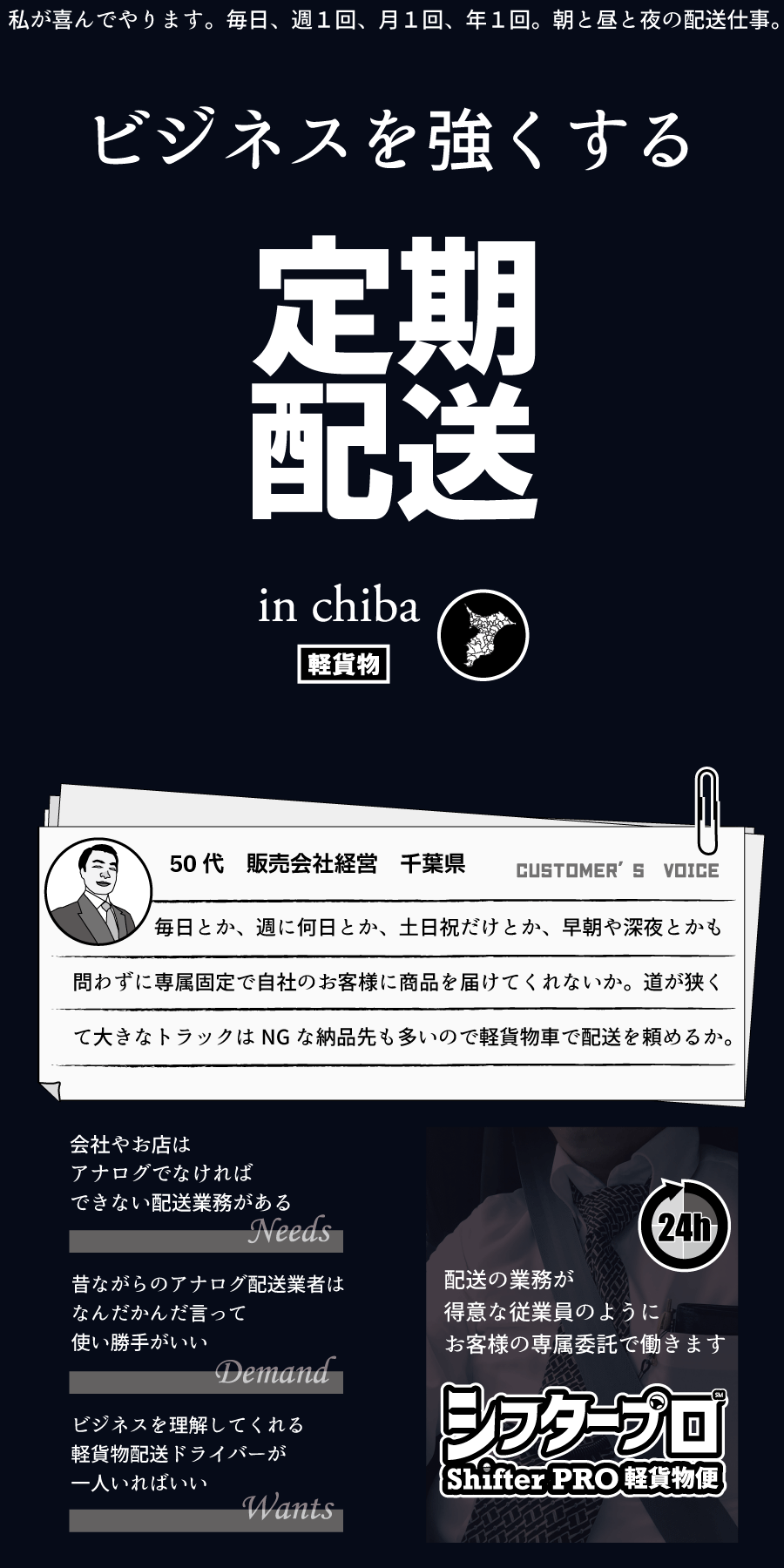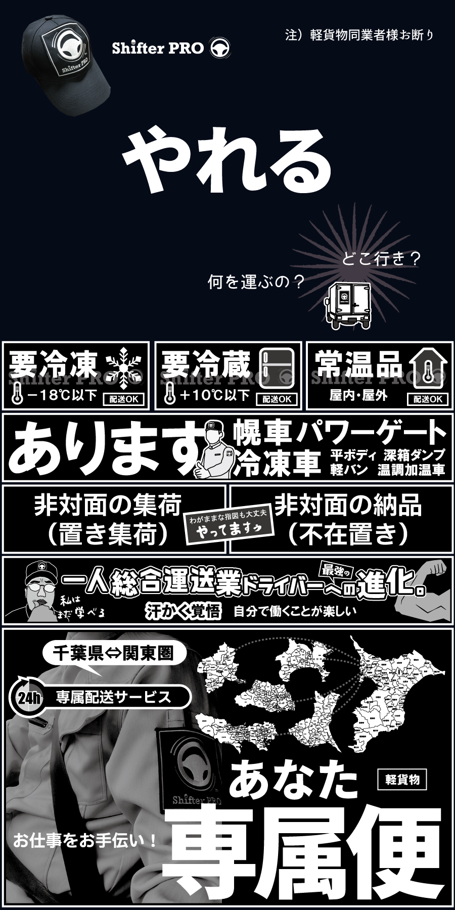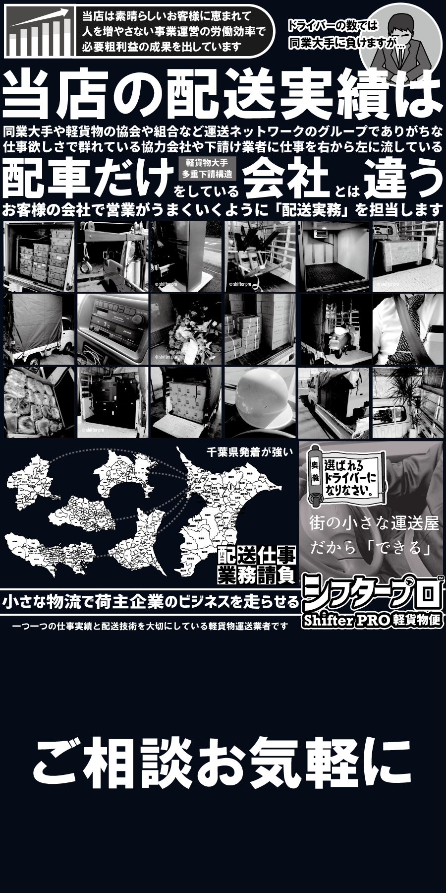 シフタープロ軽貨物便は千葉県の全域での、定期配送、当日便、緊急便、至急便、軽貨物チャーターを365日24時間で年中無休の稼働をワンチーム責任稼働体制でお客様からダイレクトに業務請負しています。関東圏、都内や千葉隣県もシフタープロ軽貨物の便が