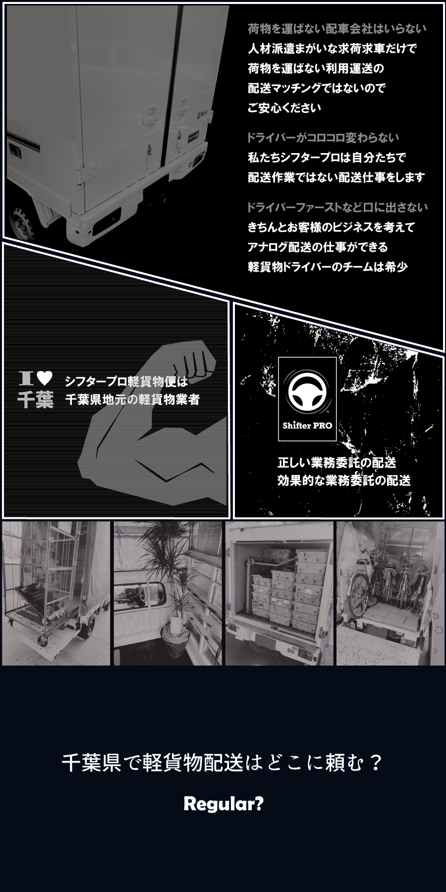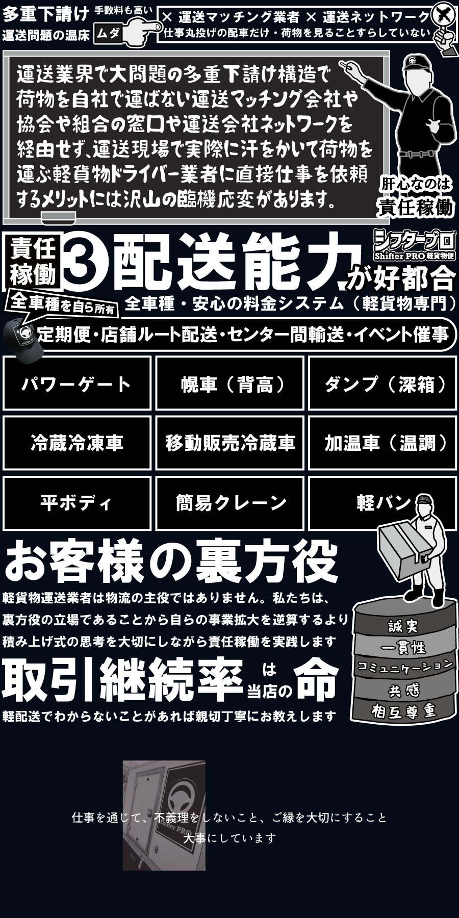 私たち千葉県の軽貨物シフタープロが事業展開で集中していることは、荷主企業と物流企業のビジネスを中長期で応援する裏方役の立場で働くことです。主役はお客様です。ドライバーファーストではありません。物流を小さく考えるご縁ある取引先の事業繁栄と私た